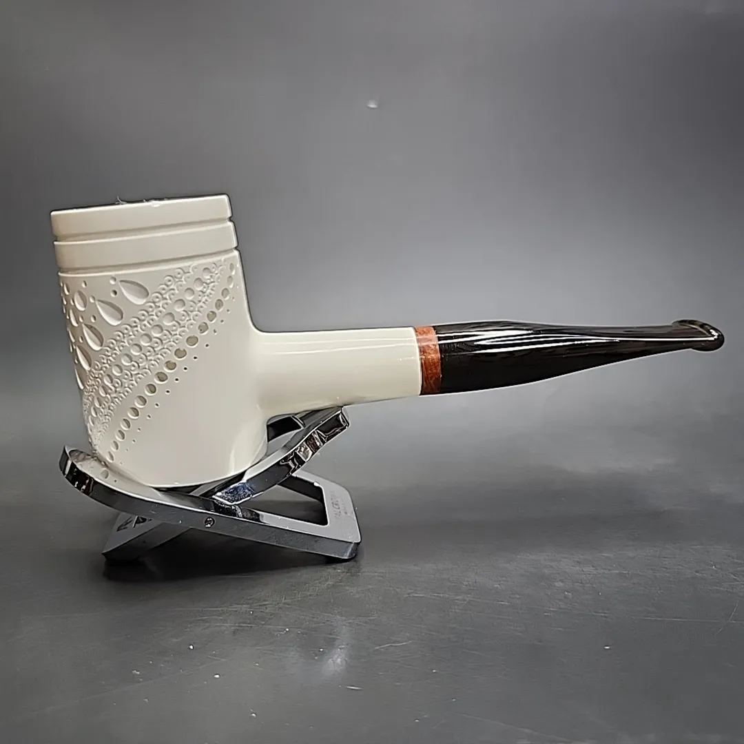 I few months ago I decided to diversify the kinds of shapes MBSD was offering for its meerschaum pipes. The reason for this was simply that I wanted meerschaum pipes that more closely resembled the shapes found in briar pipes, as well as the classically Turkish designs. First, I looked to the Danish scene for inspiration; next, I looked toward the Italians. While I’m still having Danish and Italian-style meerschaums made for MBSD, I thought that English and French shapes were becoming under-represented. So, I figured some traditional briar pipe shapes were in order. This come came from my asking my carver if he could create a poker with as much heft as my beloved Ferndown ones. At 6.5 inches, it’s almost hammer-like, albeit with some beautiful, Turkish latticework to add a certain distinguished air.