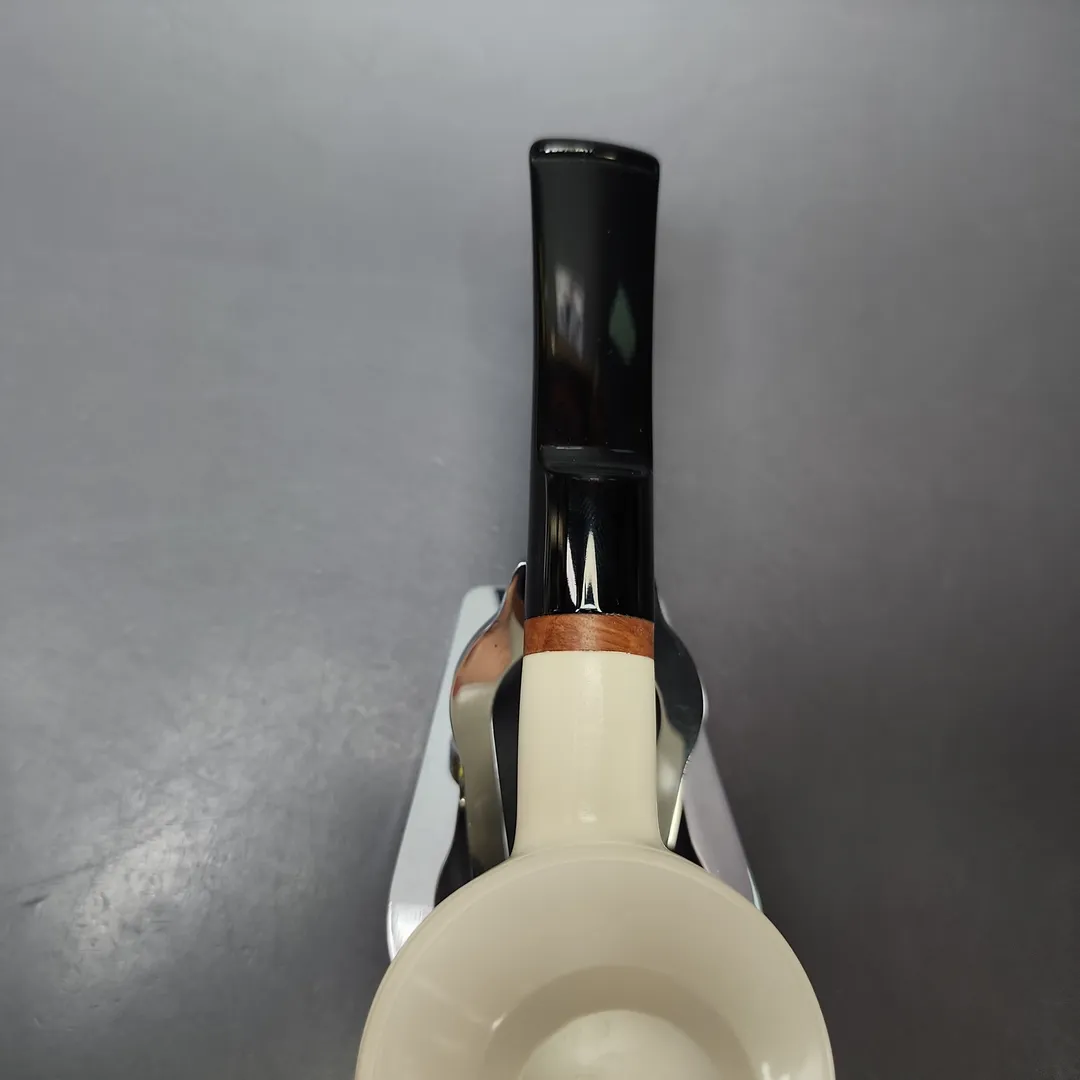 For the last 100 years, distinctly squat bulldog and Rhodesian shapes have come in and out of fashion in waves, without ever going away. From the “bullcap” Rhodesians of Custom-Bilt and LHS, to Dunhill’s O, PO, and OD 838, and to the great, traditionally-inclined artisans who followed, such as J.T. Cooke, Ferndown, Michael Parks, such shapes have been reborn again and again. Our MBSD Meerschaum rendition, seen here, happens to be one of our best-selling designs, though with that kind of history behind it, it’s easy to see why.