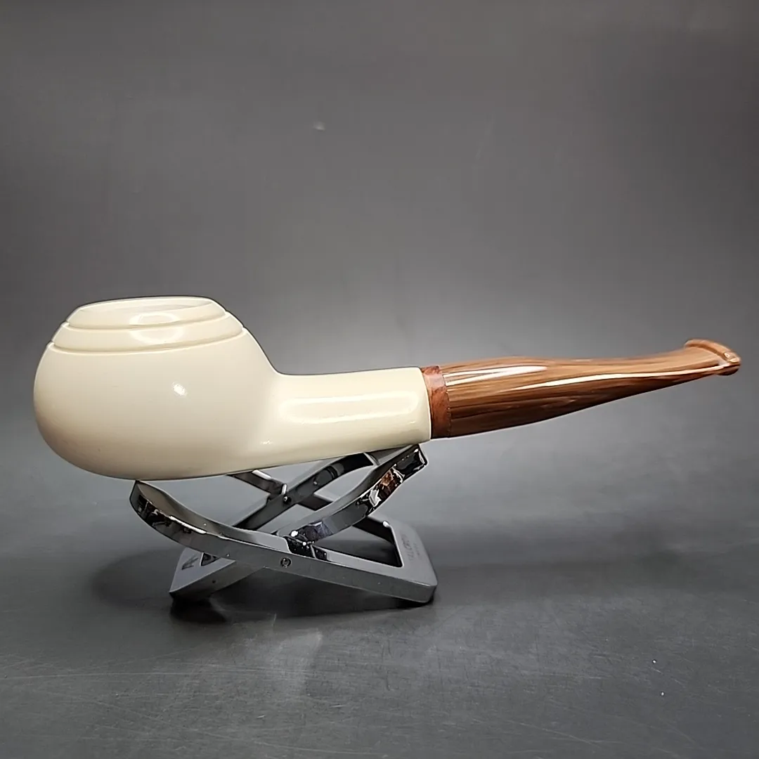 As I recently discussed on a listing for a Doctor’s Pipe by Roman Kovalev, squat shapes are both thoroughly modern and richly storied in the world of pipes. From Sixten Ivarsson’s trailblazing innovations to later artisans in Denmark (e.g., Jess Chonowitsch), Japan (Tokutomi), America (Prevost) and even Italy (Gamboni), wider, vertically-compressed shapes have been subject to a continuous reinterpretation. I thought it would be nice to see this modern tradition extended to the world of meerschaum, and through the tireless work of my carver, that’s how this one came to be.