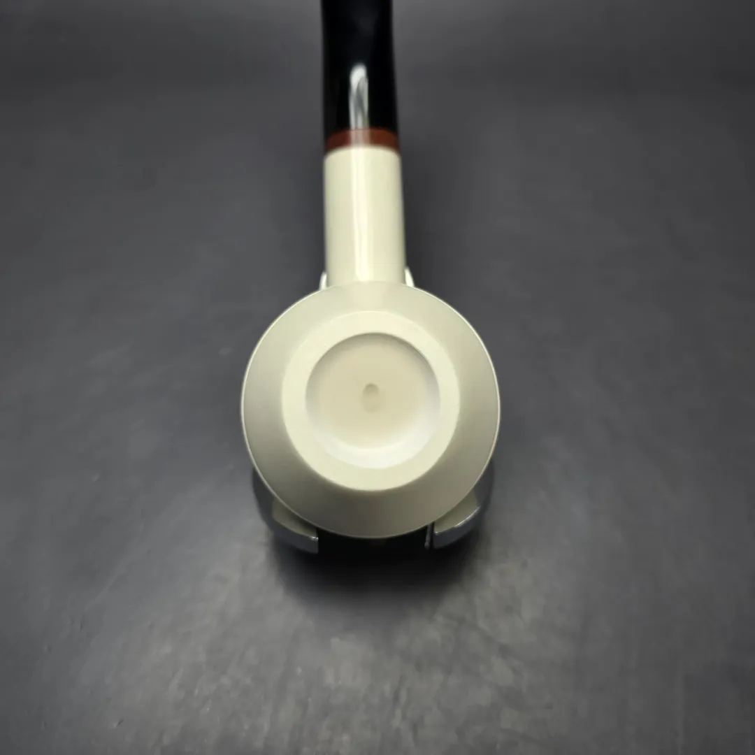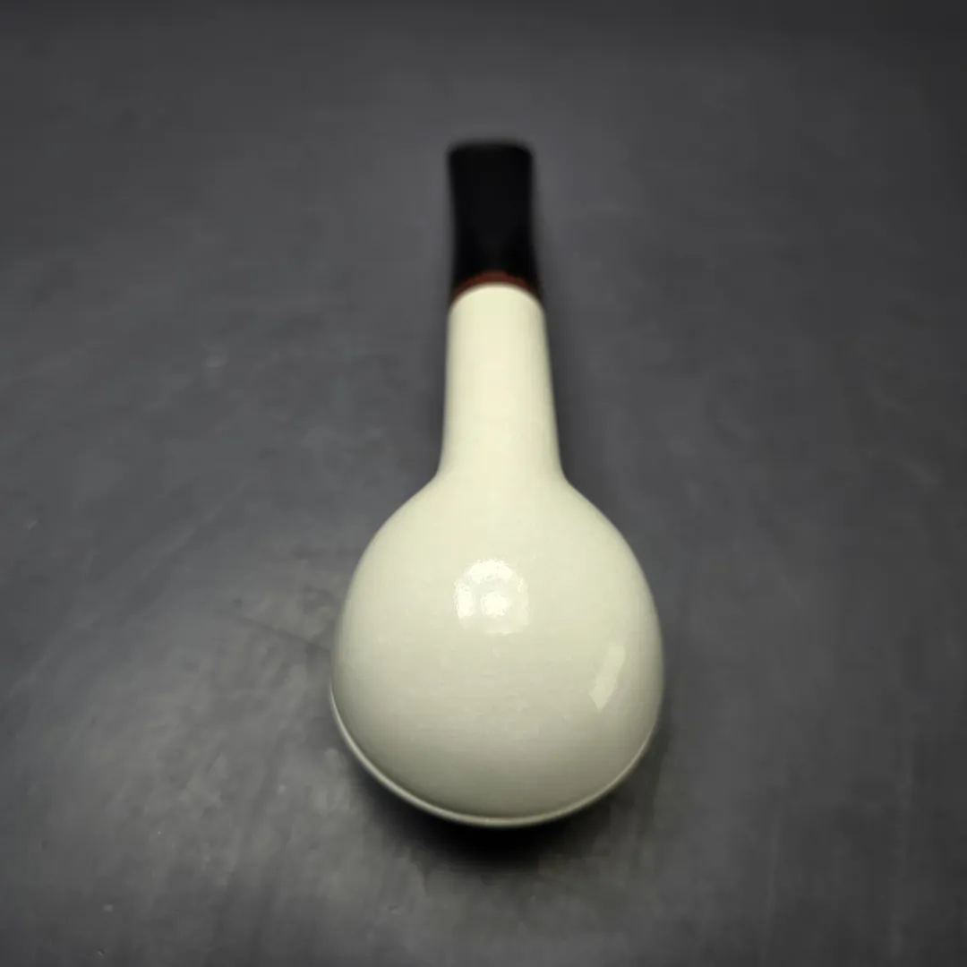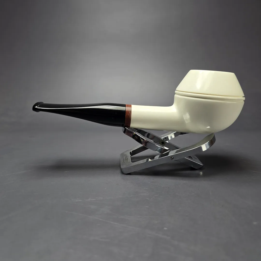 Some of the best-selling shapes in our MBSD Meerschaum catalog are, oddly enough, Rhodesian renditions modeled on 20th century briars. From thick American bullcaps, to broad-bowled Dunhill homages, to princely French-style pieces, it would appear that what works for briar in this vein also very much works for meerschaum. This is another example of an MBSD Meerschaum Rhodesian, a slightly squat, very traditional rendition, though in this instance it has a little something extra going for it. While all of our meerschaums are made from high-grade block meerschaum, this one is made from extra-high-grade “translucent meerschaum,” famous for its unrivaled lightness, purity, porosity, and the speed at which it colors. If you look closely, you’ll see that the bowl is not perfectly white, but has a slight marbled appearance, which is one of its hallmarks.