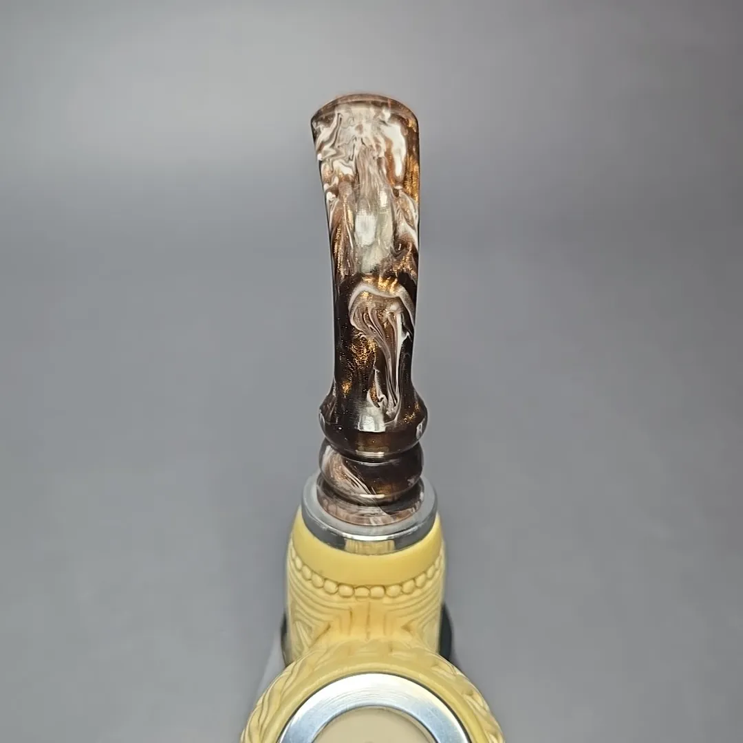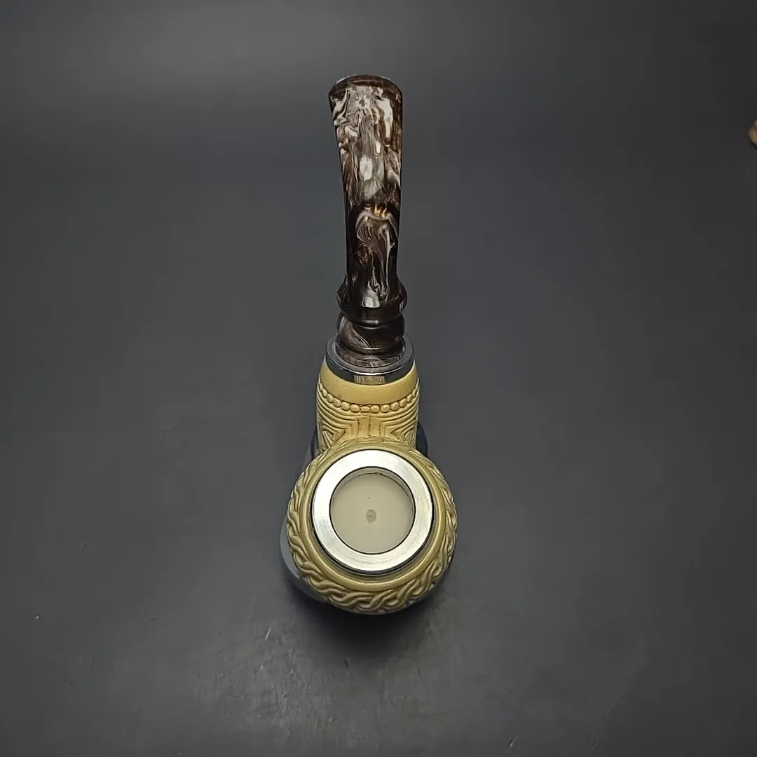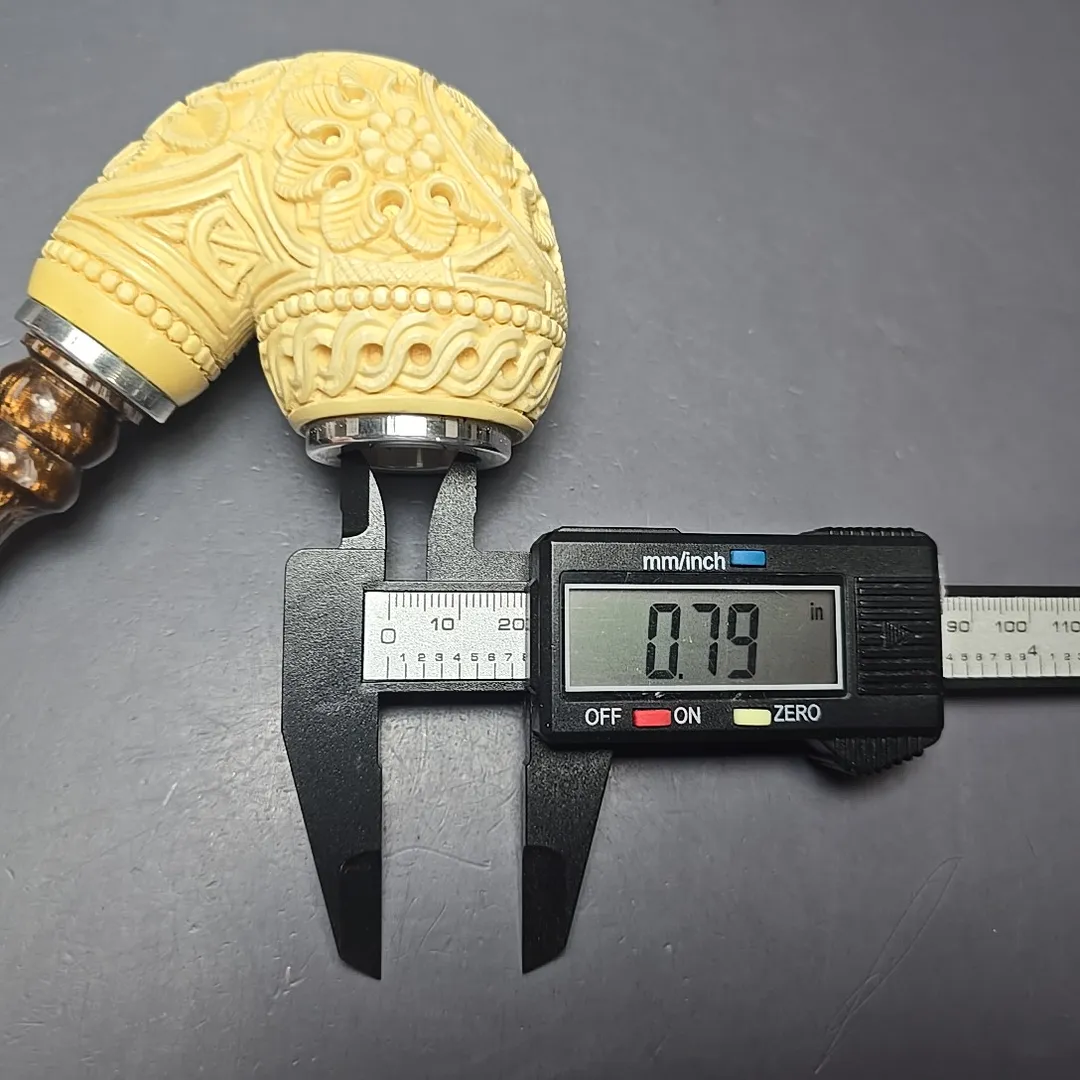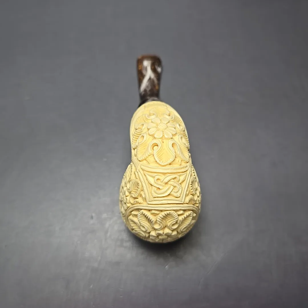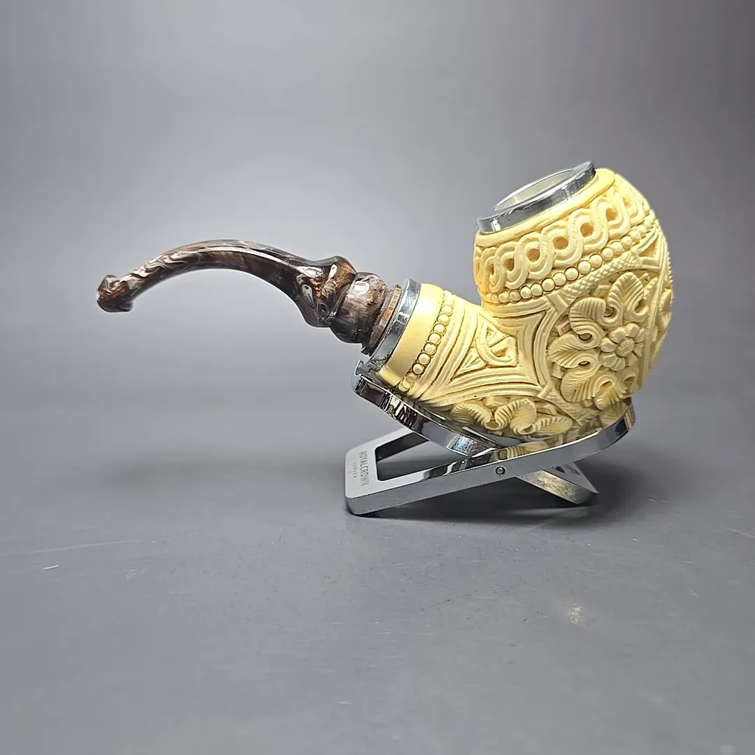 In the case of this one, for example, the idea was to take something akin to a Danish egg from the briar artisan world, such as those one might see in the work of Former, S. Bang, or the many pipe makers that have emerged in their wake, and give it not only a more “Turkish” feel, but perhaps even a more lavish one. Carved from premium meerschaum and dressed in floral carvings, it features mounts of sterling silver at both ends, as well as a reverse calabash system in its shank, which should provide an even cooler, drier smoke than a standard-bore meerschaum pipe.