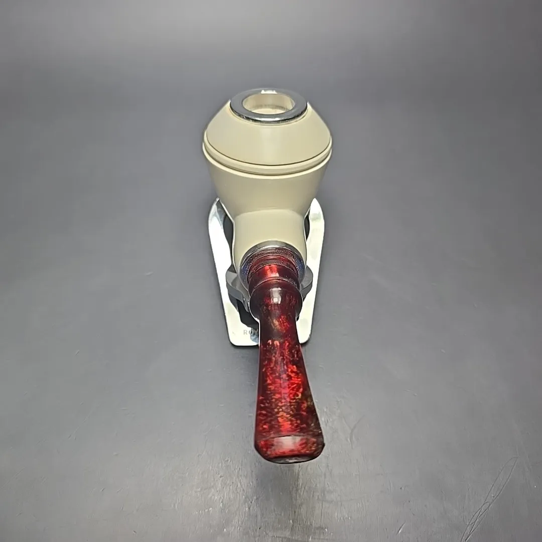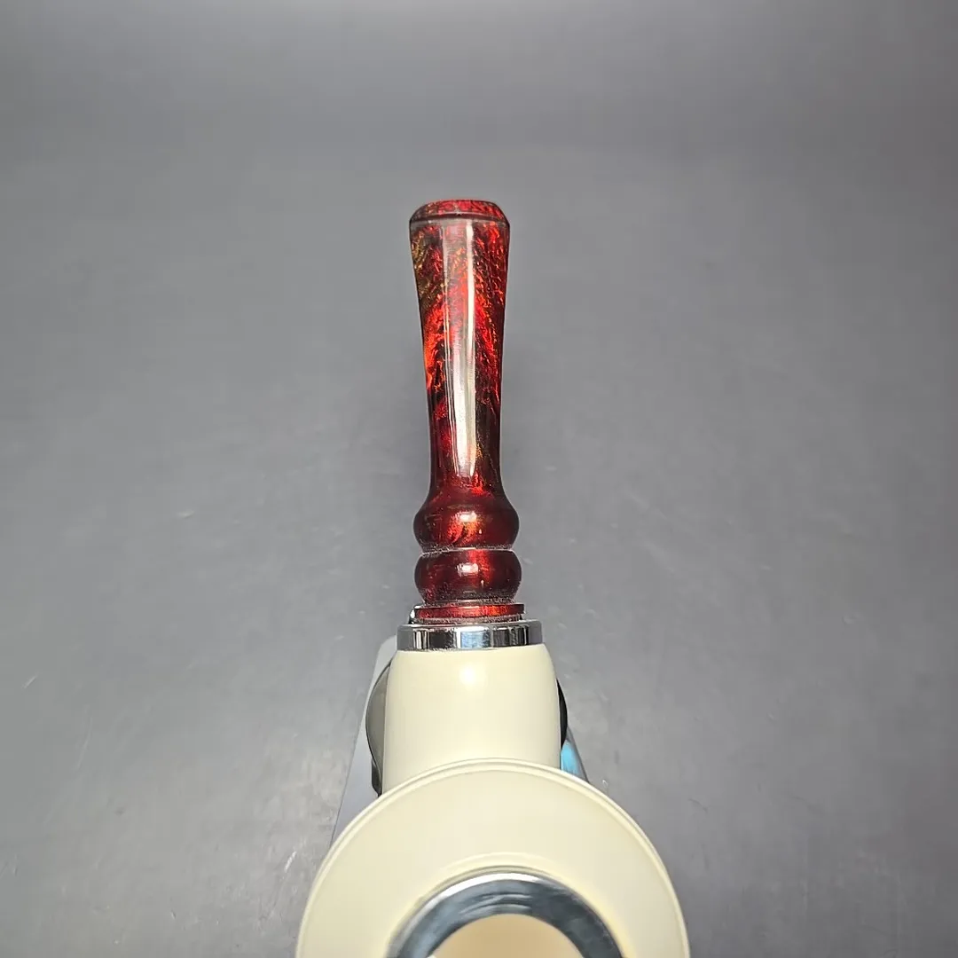 Long-time visitors to MBSD Pipes will know how much I enjoy blending various shapes and styles for our meerschaum pipe designs, especially those of the briar artisan scene, and this one is certainly no exception. Taking the form of a bulbous, “mushrooming” hybrid of acorn, Dublin, and Rhodesian shapes, it’s a rather “Danish” design, influenced by the unmistakably plump compositions of masters such as Jens Tao Nielsen and Nanna Ivarsson. In addition to its twin silver mounts, the pipe also features something far less common in such pipes, a reverse calabash system in its shank, which should provide an even cooler, drier smoke than a standard-bore briar or meerschaum pipes