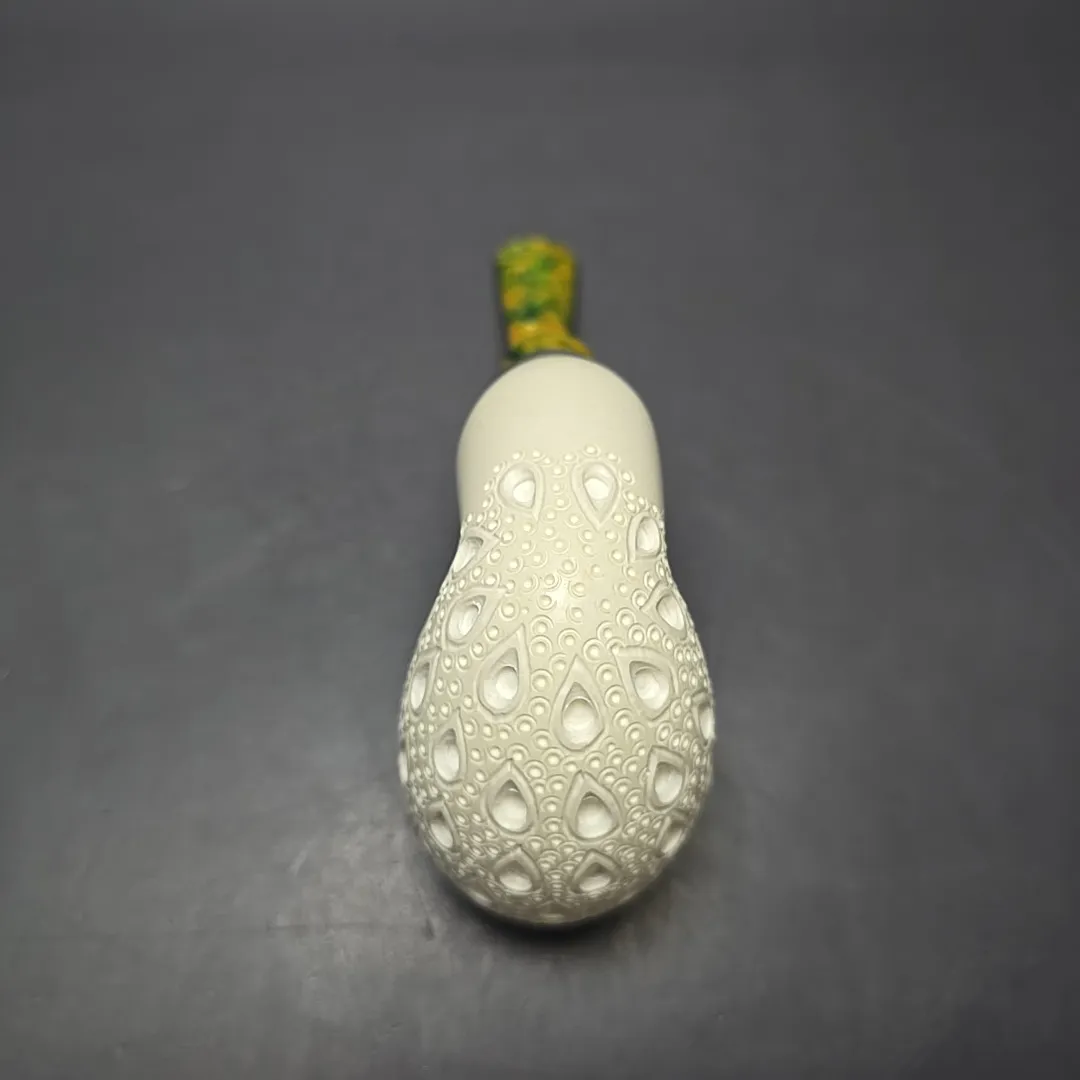 Many of the designs for our MBSD Meerschaums are influenced by post-war Danish artisan briars, as well as the styles pursued by the pipe makers who followed in their wake. Often this results in brandy, Dublin, and Rhodesian shapes inspired by the likes of Former, or S. Bang, though in the case of this one, the inspiration came from some of the earliest pioneers in Scandinavian handmade pipes. Taking the form of a slightly plump and more than slightly tall, stacked egg, the aim was to try to capture the distinctive shaping of certain makers within the 1960s Pibe-Dan (later known as Pipe Dan) milieu, such as Sven Knudsen, Gert Holbek, or Poul Hansen. Less a direct copy than a not to the spirit of such designs, the pipe also features a far more Turkish, teardrop lattice carved finish, as well as a reverse calabash system in its shank, which should provide an even cooler, drier smoke than a standard-bore briar or meerschaum pipe.