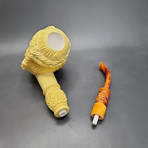 The closest classical art form to meerschaum carving is sculpture. In this instance, the closest analog in the sculptural arts as classically defined, is the bust. By this I mean depictions of the upper torso of human figures, rather than other body parts. For about as long as meerschaum pipes have been made, carvers have been sculpting them in human forms, typically famous figures of an era (such as nobility), or cultural archetypes (such as the sultan or the pirate). This pipe, from Eskişehir’s master Kenan, is carved in the form of a viking warrioress, including period attire. I find can always tell how good an artist – in whichever art form – is by looking at their ability to represent hair. The free-flowing and braided hair sections on this young woman are particularly impressive, as is the rest of the figure.