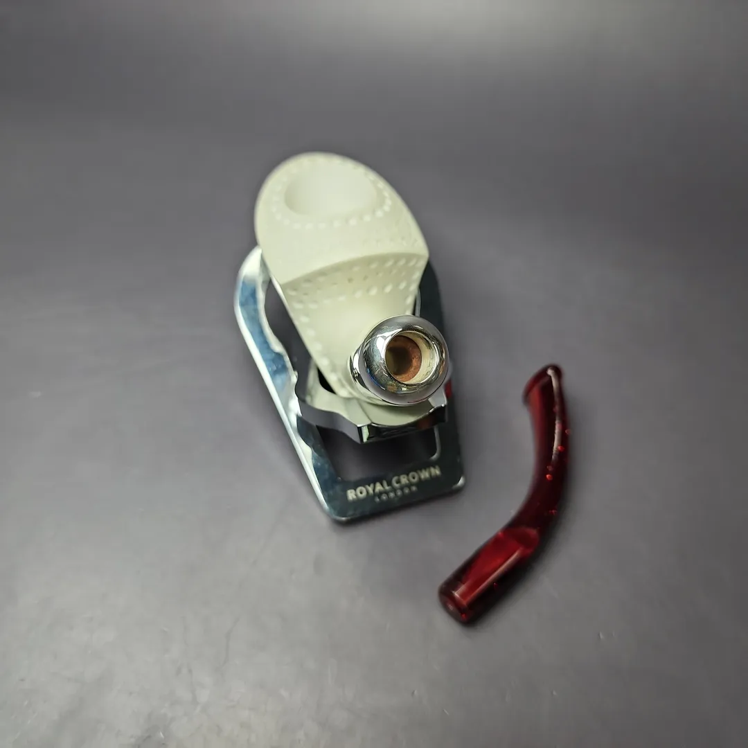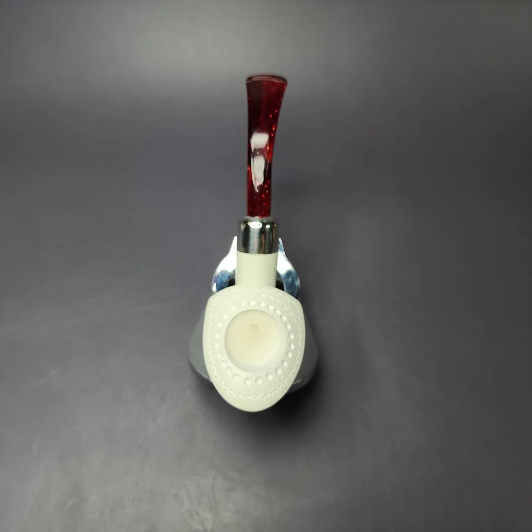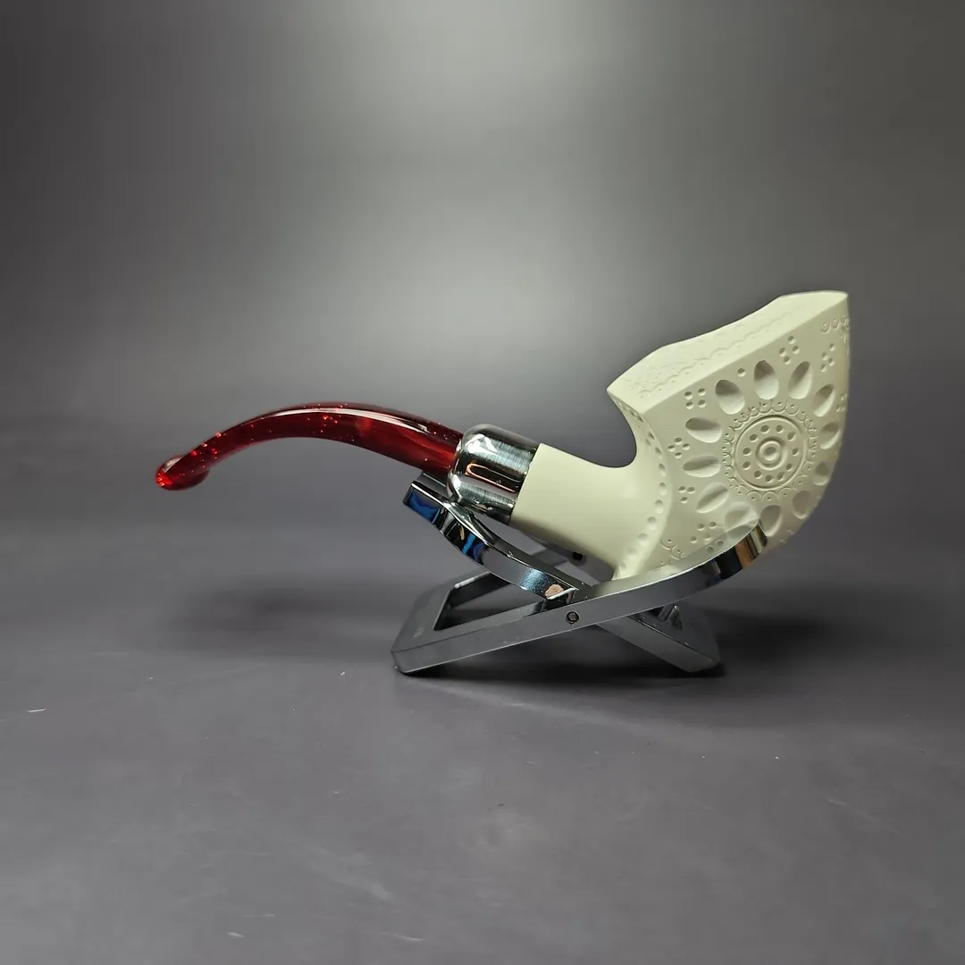 The pickaxe is one of our best-selling and most unique additions to the MBSD Meerschaum catalog. Taking inspiration from briar renditions, one as diverse as those of Dunhill, Claudio Cavicchi, and Poul Winslow, my carver came up with a series of pickaxe shapes that would better suit the medium of meerschaum. This marvelously lightweight version features plenty of classic Turkish latticework, as well as a sterling silver army mount, which holds in place a shimmering, red Lucite stem.