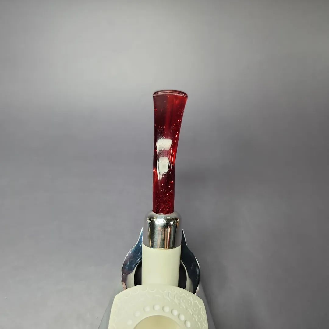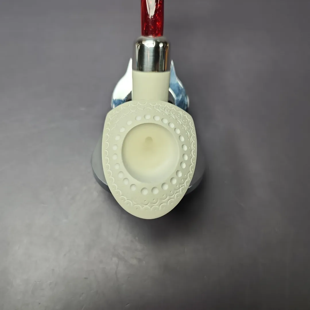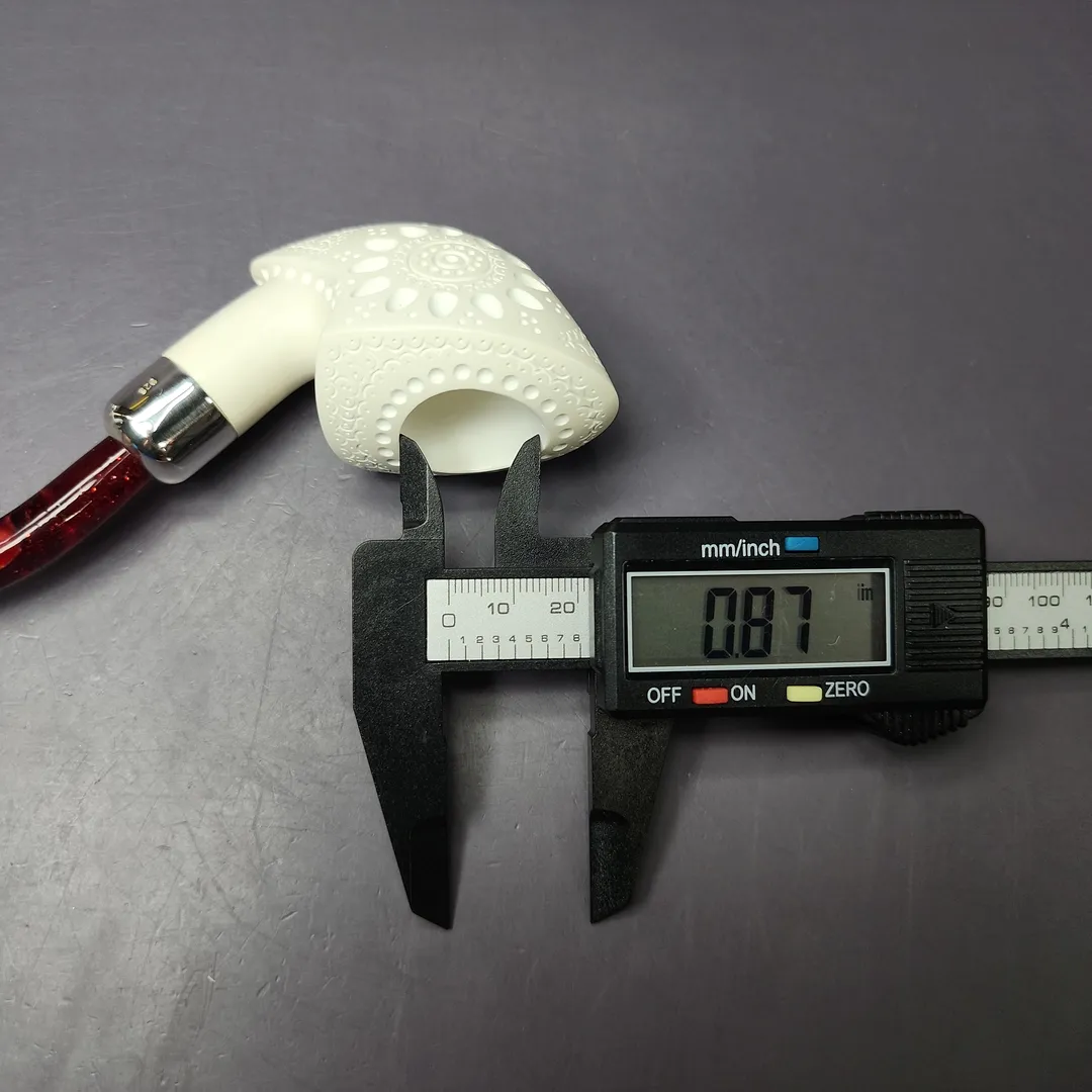 The pickaxe is one of our best-selling and most unique additions to the MBSD Meerschaum catalog. Taking inspiration from briar renditions, one as diverse as those of Dunhill, Claudio Cavicchi, and Poul Winslow, my carver came up with a series of pickaxe shapes that would better suit the medium of meerschaum. This marvelously lightweight version features plenty of classic Turkish latticework, as well as a sterling silver army mount, which holds in place a shimmering, red Lucite stem.