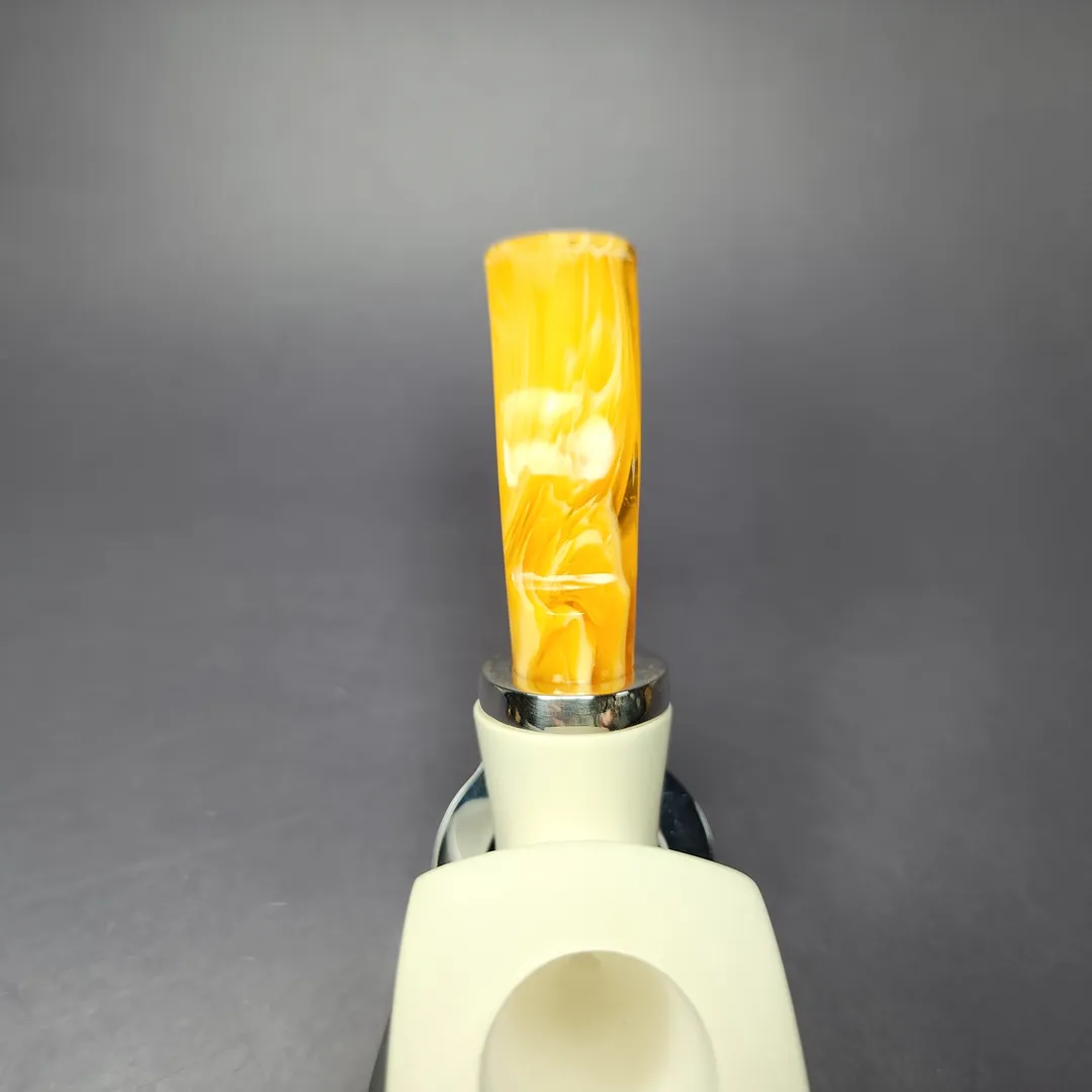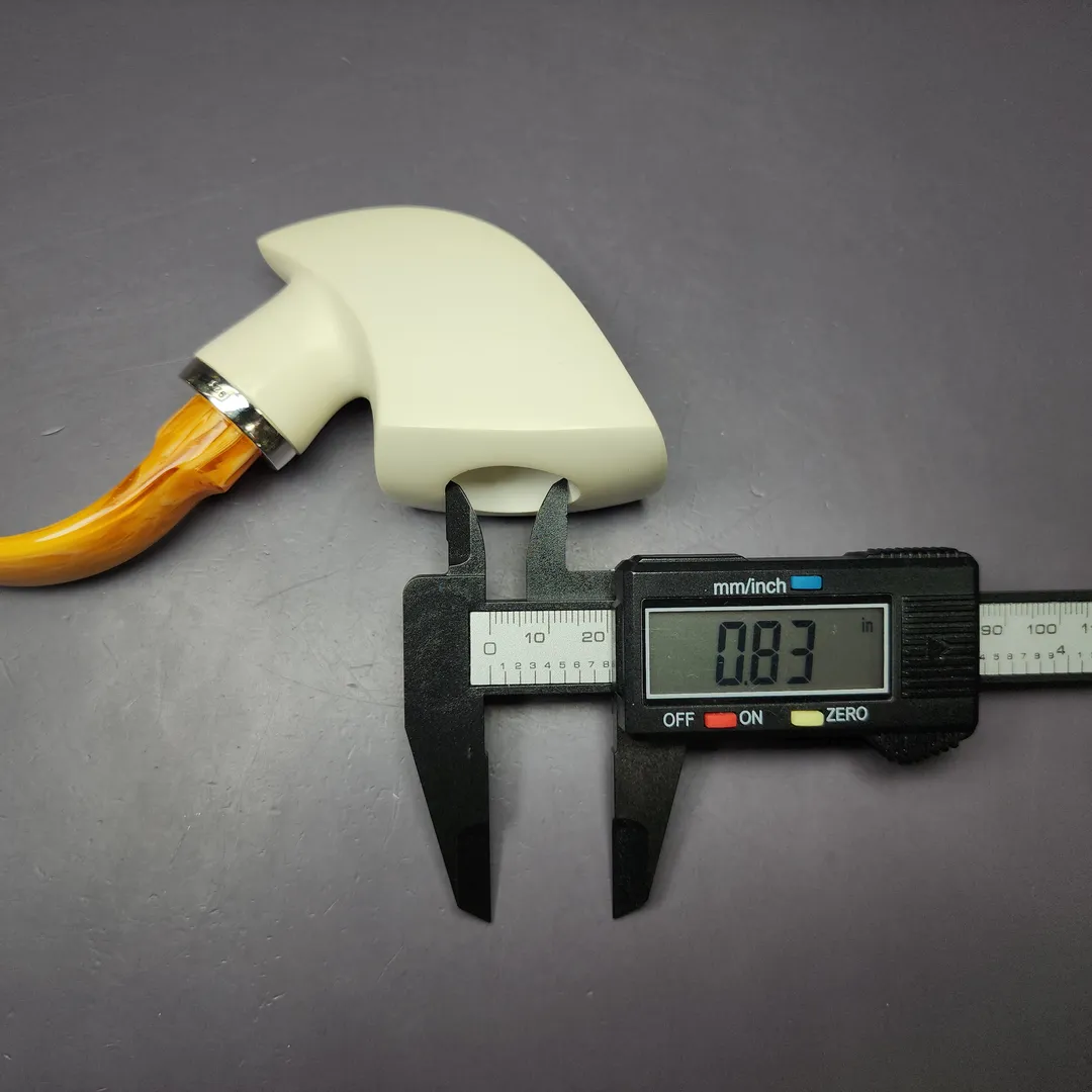 The pickaxe is one of our best-selling and most unique additions to the MBSD Meerschaum catalog. Taking inspiration from briar renditions, one as diverse as those of Dunhill, Claudio Cavicchi, and Poul Winslow, my carver came up with a series of pickaxe shapes that would better suit the medium of meerschaum. This rather compact rendition leans more Danish than certain others, especially given its paneled design. It also features a reverse calabash system in its shank, for cooler, drier smokes.