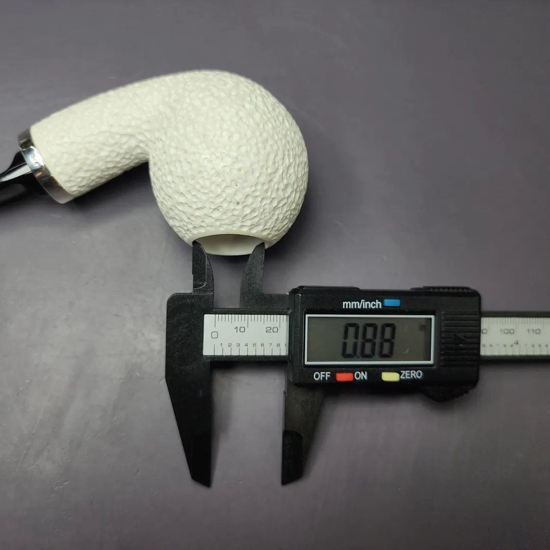This particular Silver line meerschaum represents something of a synthesis of styles. On the one hand, the essential form is inspired by post-war Danish pipe making, especially the bulbous apple shapes of, say, Tao, Former, and Ballaby. On the other, the finishing is more in line with the classic “golf ball” rustication of Turkish meerschaums. To add to that, the pipe also features a more contemporary addition in the form of a reverse calabash nestled in its shank, allowing for a cooler, drier smoke.