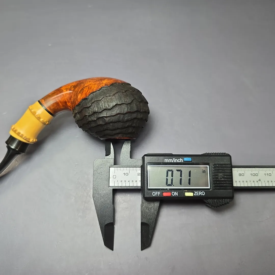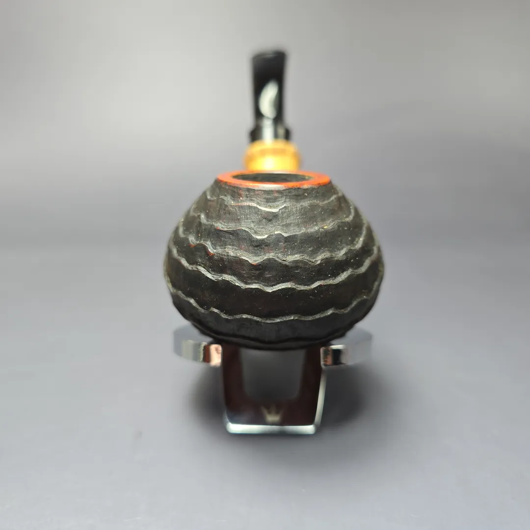 In the case of this one, that “carving” is quite literal. Wandi Riyadi is one of a relatively small number of high-end artisan carvers to frequently rusticate his pipes (at least, in a manner far removed from the renowned Italian pebble-dash approach). Md. Angga also utilizes rusticated finishes, though unlike Riyadi’s “ring grain” style hewing, Angga typically proceeds by way of stepped layers, as if the bowl were a budding thistle. It’s an interesting look, one made all the more interesting in this case by way of a squat, brandy-like figure and bamboo shank extension.