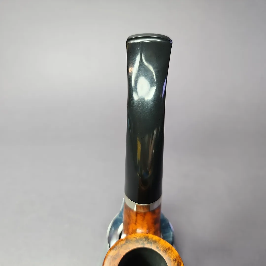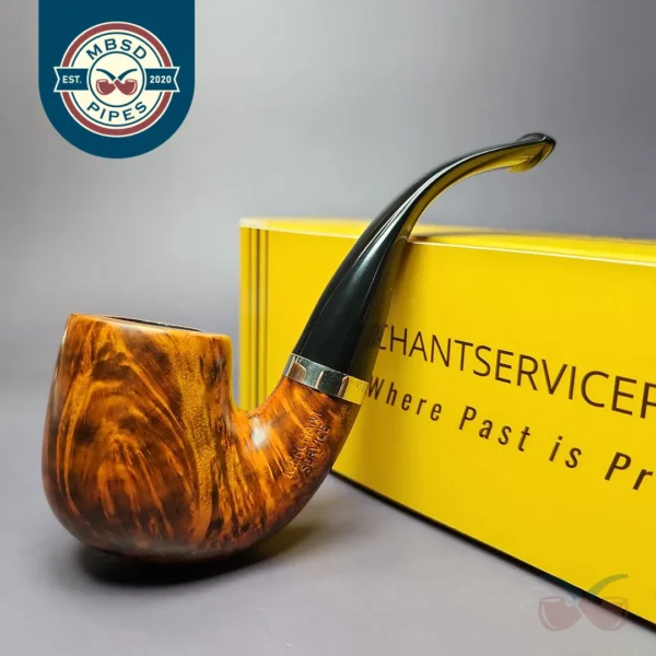Merchant Service was, originally, a mid-century British pipe brand founded by Herbert Merchant, and is today most remembered for manufacturing the pencil-shank billiard pipes favored by Bing Crosby. As with so many pipe companies of days gone by, Herbert Merchant Inc. was ultimately dissolved, with the Merchant Service story seemingly coming to a close—until something quite special happened. The Merchant Service name was purchased by another pipe maker—this time an American artisan and Anglophile—named Gregory Polla. Polla’s love for not only the classic “Bing” model, but English pipe design more generally, led him to revive Merchant Service pipes. This he does as a “one-man factory” crafting limited runs of iconic, traditional shapes in his personal workshop. This particular Merchant Service, by Polla, is one of his “Full Bent” models, a fittingly named bent billiard that evokes the beloved Oom Paul shapes of early briar pipes.