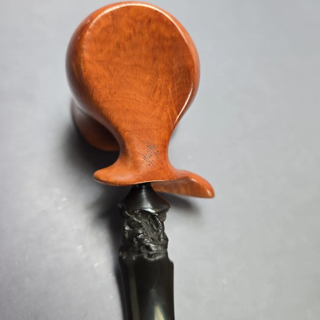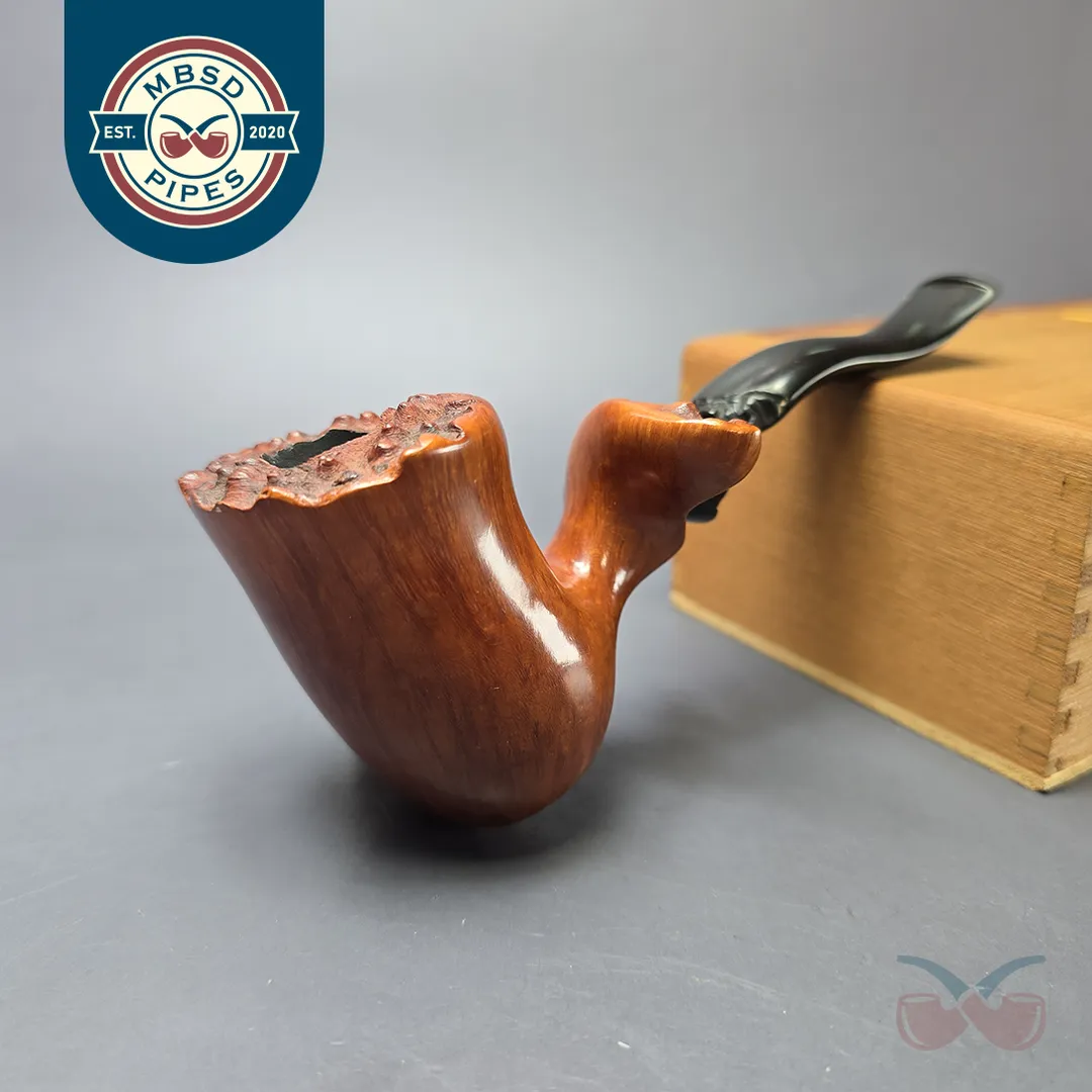 As mentioned in another of our listings, the majority of Robert Burns’ Micoli pipes are distinguished by their deep and highly unorthodox rustication, which Burns famously applies using a Dremel. And, as also mentioned in the other listing, it’s very rare to come across a completely smooth Micoli. I myself have only encountered a handful before, with this being among the handful I’ve come across in person. But, among those uncommon Micolis, the unifying thread was grain; as is often the case with pipe makers, I’d expect that Burns uses rustication both as a means of artistic expression and as a means of excising natural flaws in the briar he works with. This pipe is certainly a Micoli, embodying the fluidly freeform aesthetics found on most of his pipes (as well as one of his highly unusual, rusticated stems), but it is nonetheless a very uncommon one. Then again, it looks like he was working with uncommonly well-mannered briar in this instance and, as every good pipe maker knows, that’s a kind of briar worth listening to.
