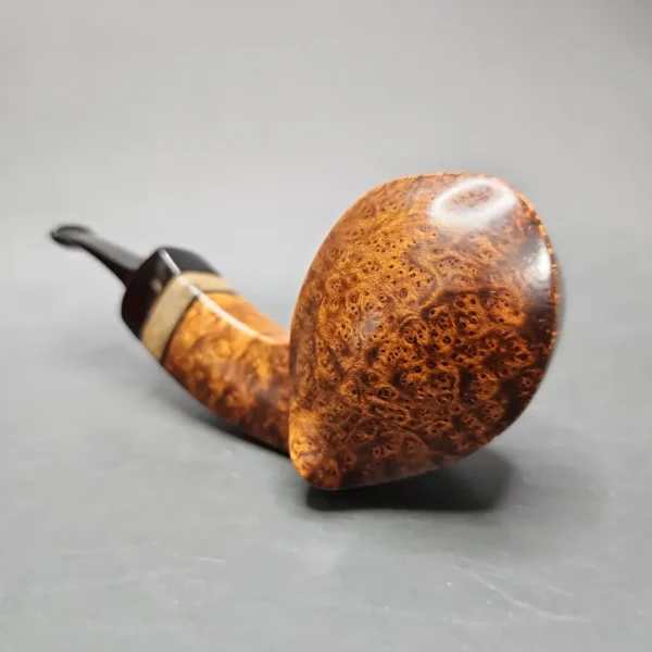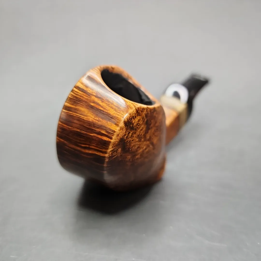 I’ve been wondering when we might get one of Mike’s pipes through our estates trade-in program. He’s been making pipes for about 10 years now, but his production remains fairly limited the pipes he does make are pretty hard to get your hands on—and in my line of work, pretty hard to get people to give them up. It’s not difficult to see why, either. This is one of his blowfish shapes, which I’ve found he does extremely well, while keeping each a little different. This is a slightly smaller one, with a spalted tamarind accent and, of course, a hand-cut ebonite stem. It has excellent shaping, incorporating a little of the Japanese-inspired asymmetry of contemporary artisan renditions, while keeping a firm sense of order and purposiveness in the resulting figure. It also makes excellent use of briar grain, with the shape’s signature, convex side panels being completely covered in bird’s-eye, and the flattened planes between them striated with cross-grain. Everything is beautifully tied together.