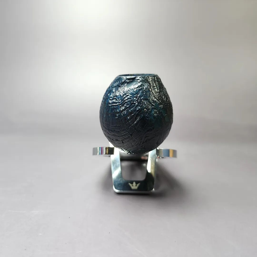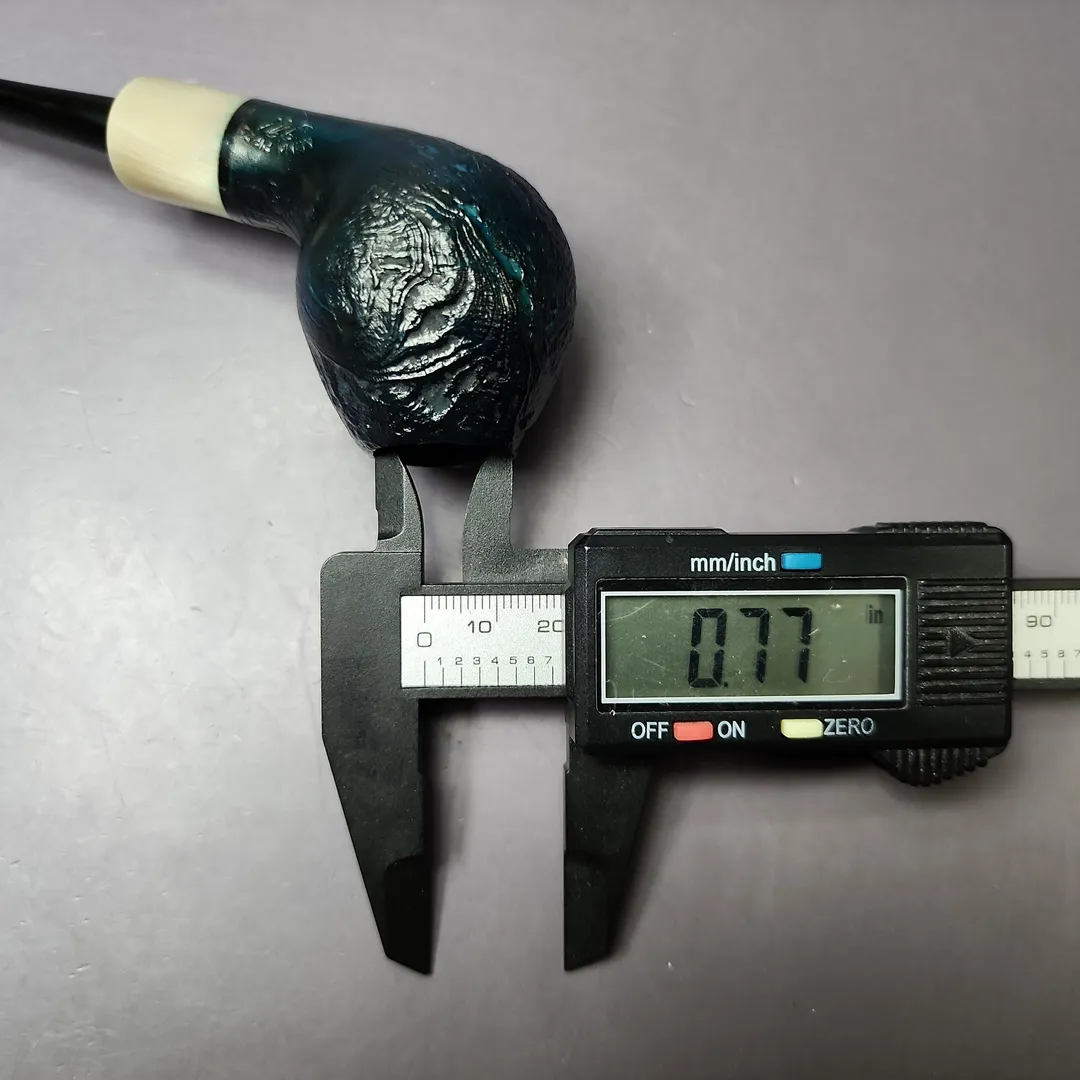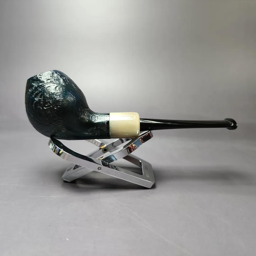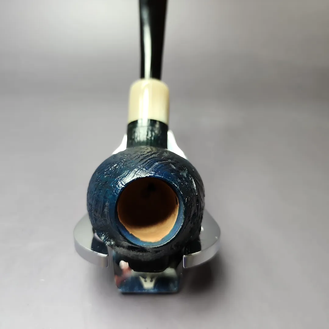 This particular pipe came to us with a batch of new old stock (NOS) pipes from a store closure a few states over. Based on what I was able to research, the Mina company runs a pipe workshop in China, not unlike HS Studio or GH Zhang, which produces a number of different makes based on the style of pipe. This one is at once a very traditional design and a quite modern one. Taking the form of a late 19th/early 20th century Belge, or perhaps Devil Anse, depending on how you look at it, the pipe is dressed in a striking blue sandblast, accented by a horn ferrule and hand-ebonite stem.