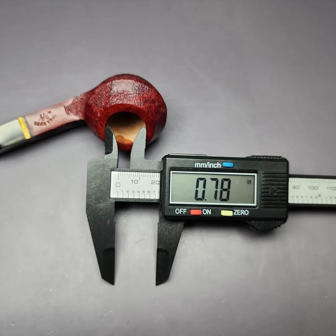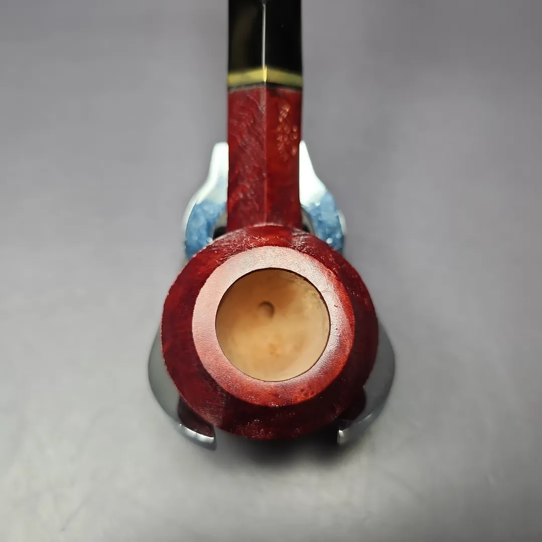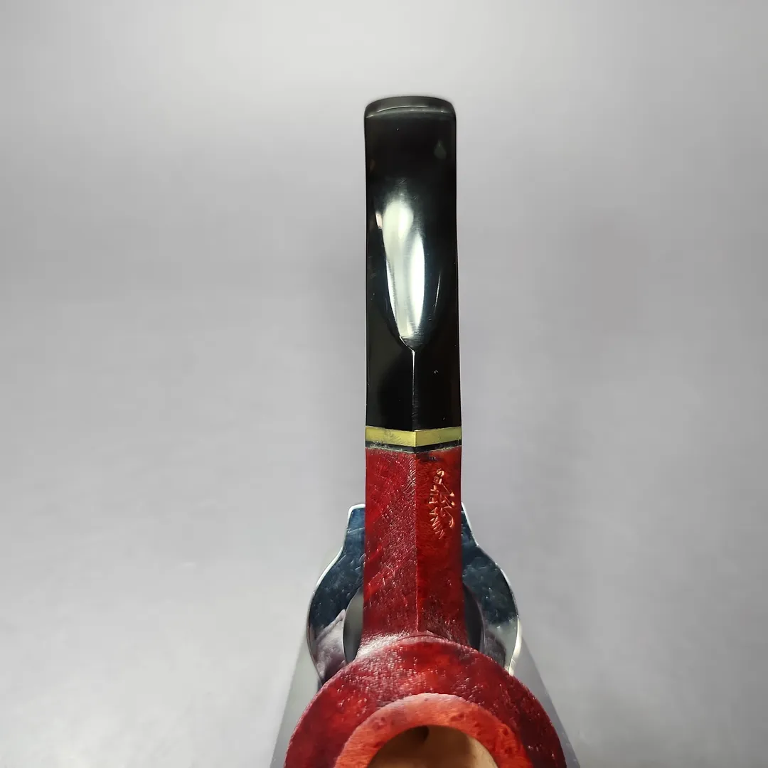 This particular pipe came to us with a batch of new old stock pipes from a store closure a few states over. Based on what I was able to research, the Mina company runs a pipe workshop in China, not unlike HS Studio or GH Zhang, which produces a number of different makes based on the style of pipe. This one is a very classical bent bulldog, with a ruby-red sandblast evocative of the great English makes of old.
