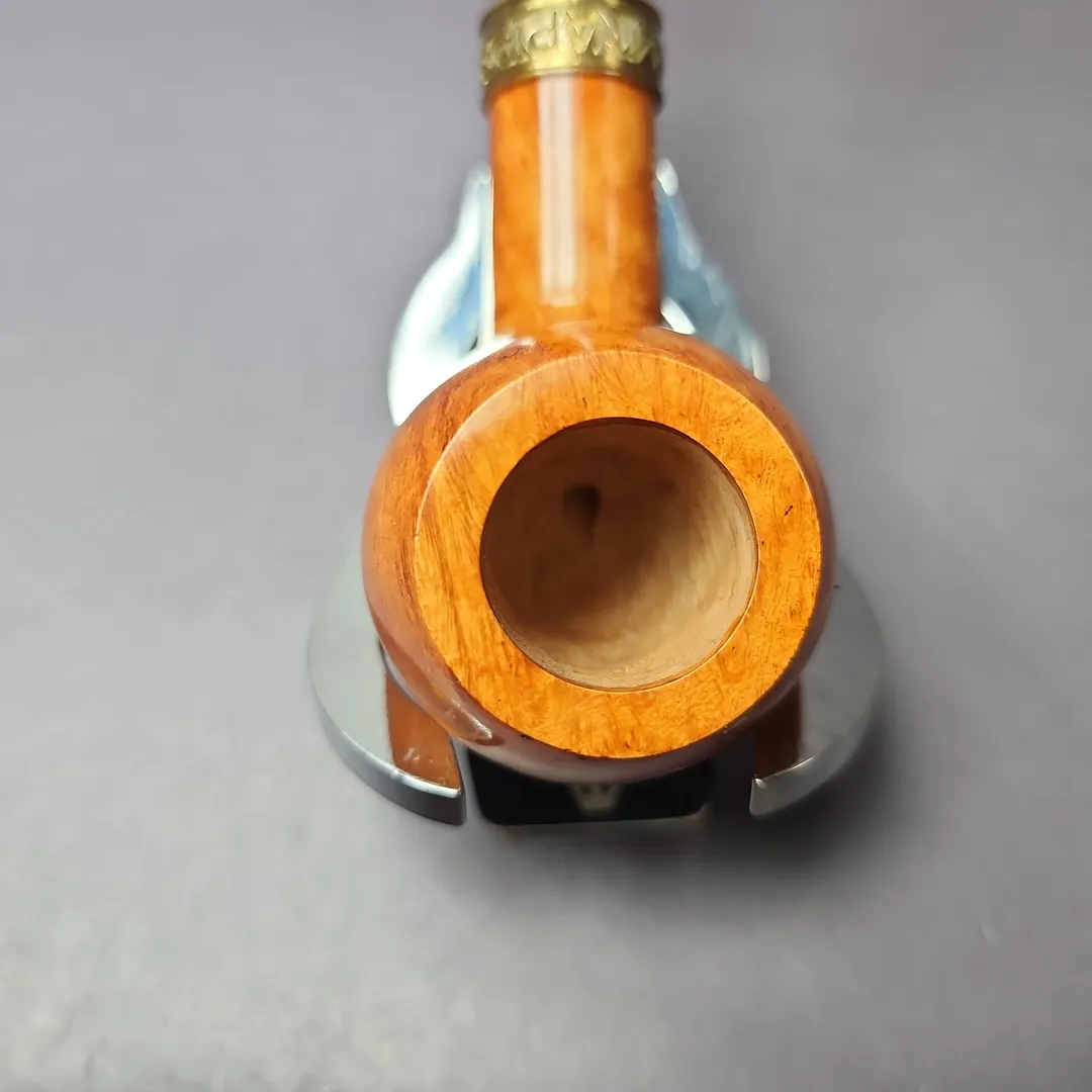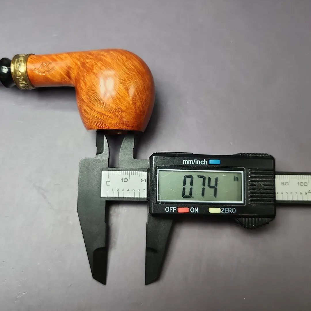 This particular pipe came to us with a batch of new old stock (NOS) pipes from a store closure a few states over. Based on what I was able to research, the Mina company runs a pipe workshop in China, not unlike HS Studio or GH Zhang, which produces a number of different makes based on the style of pipe. The design of this one is something of a “Danish apple,” in the vein of Former, for example, or Jess Chonowitsch. Sticking close to tradition, the pipe is nonetheless collared by an engraved, brass ring, which serves as a transitional element between the bowl and the pipe’s flared ebonite stem.