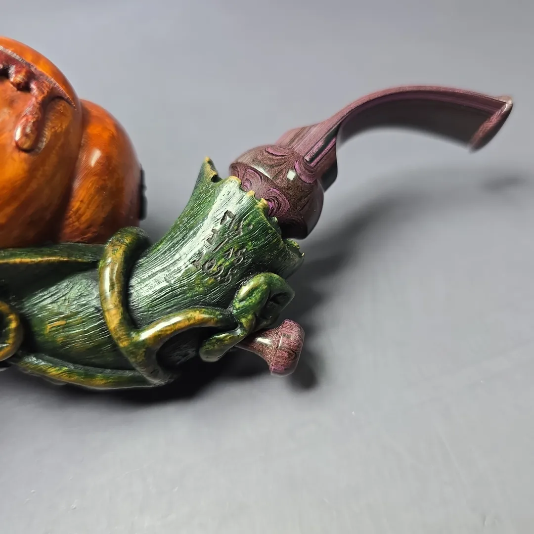 While some pipe-makers take inspiration from the natural world, or from the technologies of present and past, few of them in the contemporary seek to represent these forms in their work. Czech artisan Ondrej Bárta of Moonlight pipes does just that, in a way that recalls the intricate, figural carvings of briar pipes from the turn of the 20th century. But Ondrej also departs from the figural approach of early briar pipes by combining it with high-grade materials and a careful attention to grain patterns that is far more modern.