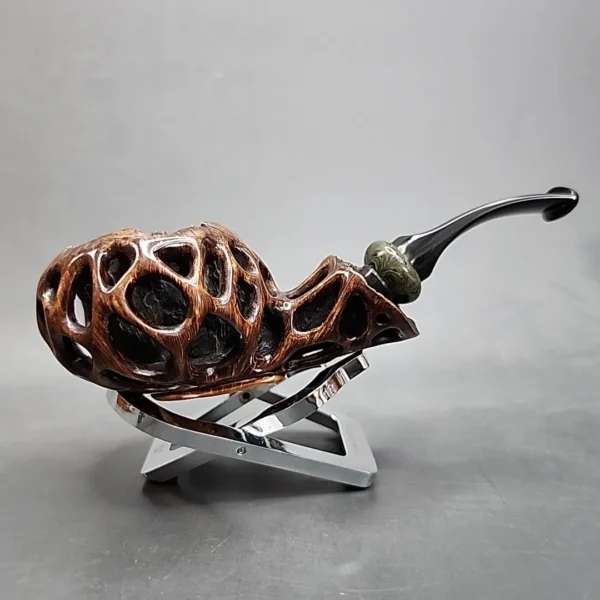 While some pipe-makers take inspiration from the natural world, or from the technologies of present and past, few of them in the contemporary seek to represent these forms in their work. Czech artisan Ondrej Bárta of Moonlight pipes does just that, in a way that recalls the intricate, figural carvings of briar pipes from the turn of the 20th century. But Ondrej also departs from the figural approach of early briar pipes by combining it with high-grade materials and a careful attention to grain patterns that is far more modern.