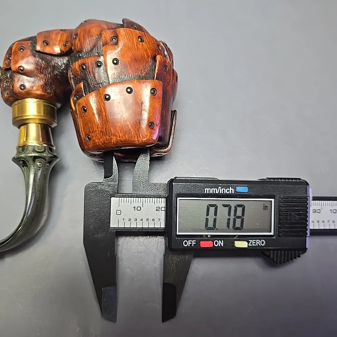 Ondrej Bárta is renowned for his figural pipe making skills and predilections. And one of his most sought after designs is his “Steampunk” Oom Paul shapes. It is not difficult to see why, nor is it difficult to see why such pipes take a very long time to construct and, consequently, have a long waiting list. As for the design itself, while the bowl is all briar, it has been meticulously carved to mimic the bolted leather and steam-driven gear mechanisms associated with the early industrial age. In fact, this patchwork of leather has even been given a “weathered” look for extra authenticity. The pipe also—quite fittingly—features a brass faux spigot mount, which pairs well with a hand-cut sea green ebonite stem and shank plug, the latter being included for ease of cleaning and general maintenance.
