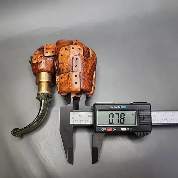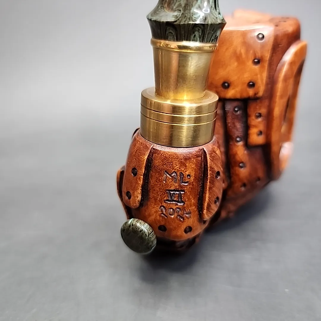 I first reached out to Ondrej of Moonlight Pipes after seeing him make something like this. In fact, it was a pipe just like this one that made me want to stock his pipes, and so I asked if he would be willing to make one for the MBSD store. “Yes,” he said, “but it will take time.” I told him that shouldn’t be a problem. Ondrej was right about the wait, but not because he was slacking off. It takes a lot of time to carve something like this, which should be apparent from the attention to detail: while the bowl is all briar, it has been carved to mimic bolted leather and mechanical gears, both to remarkable effect. The pipe also – fittingly – has a brassy faux spigot, along with a swirling green ebonite stem and shank plug for easily cleaning. As a last touch, Ondrej has also carved a matching tamper to go with the pipe.