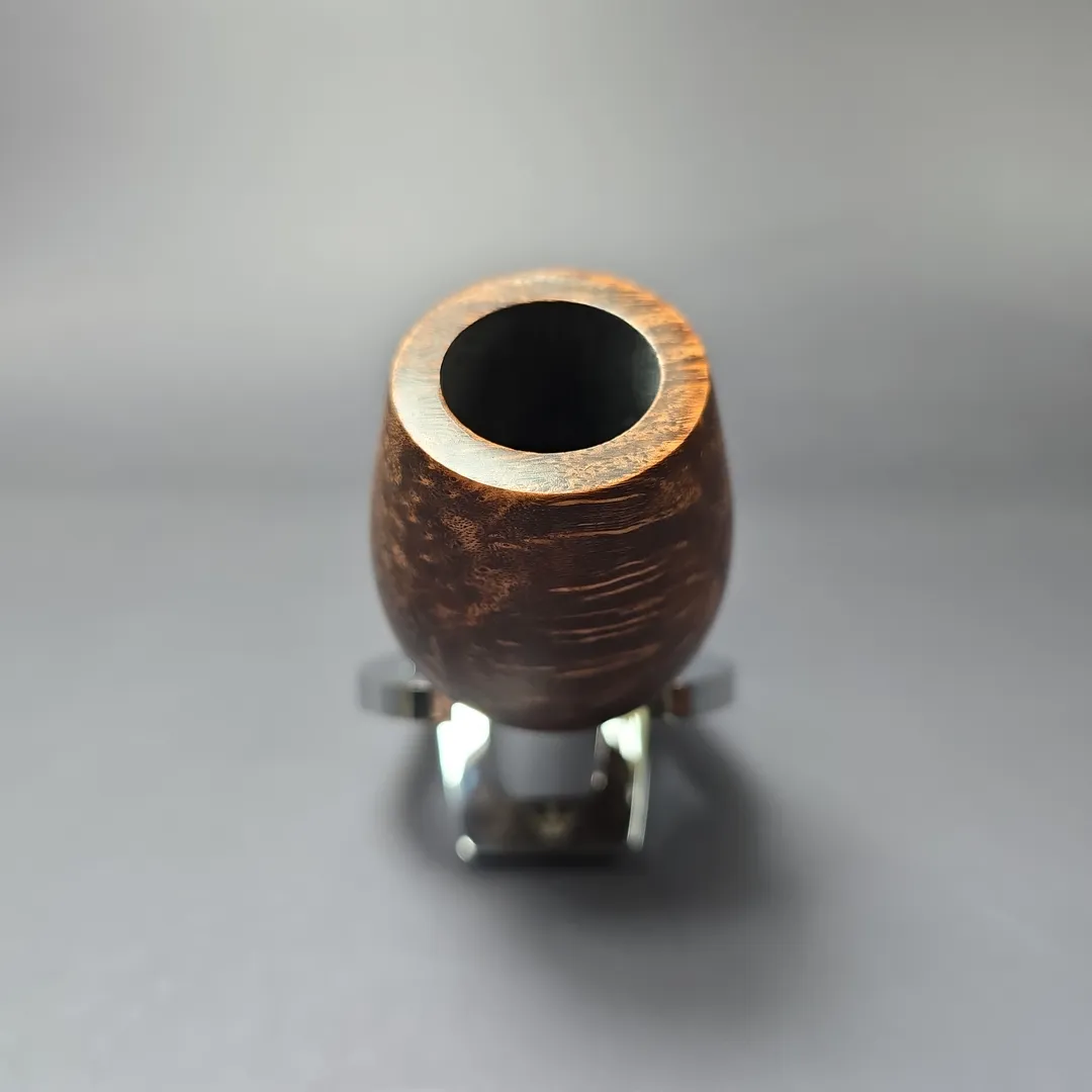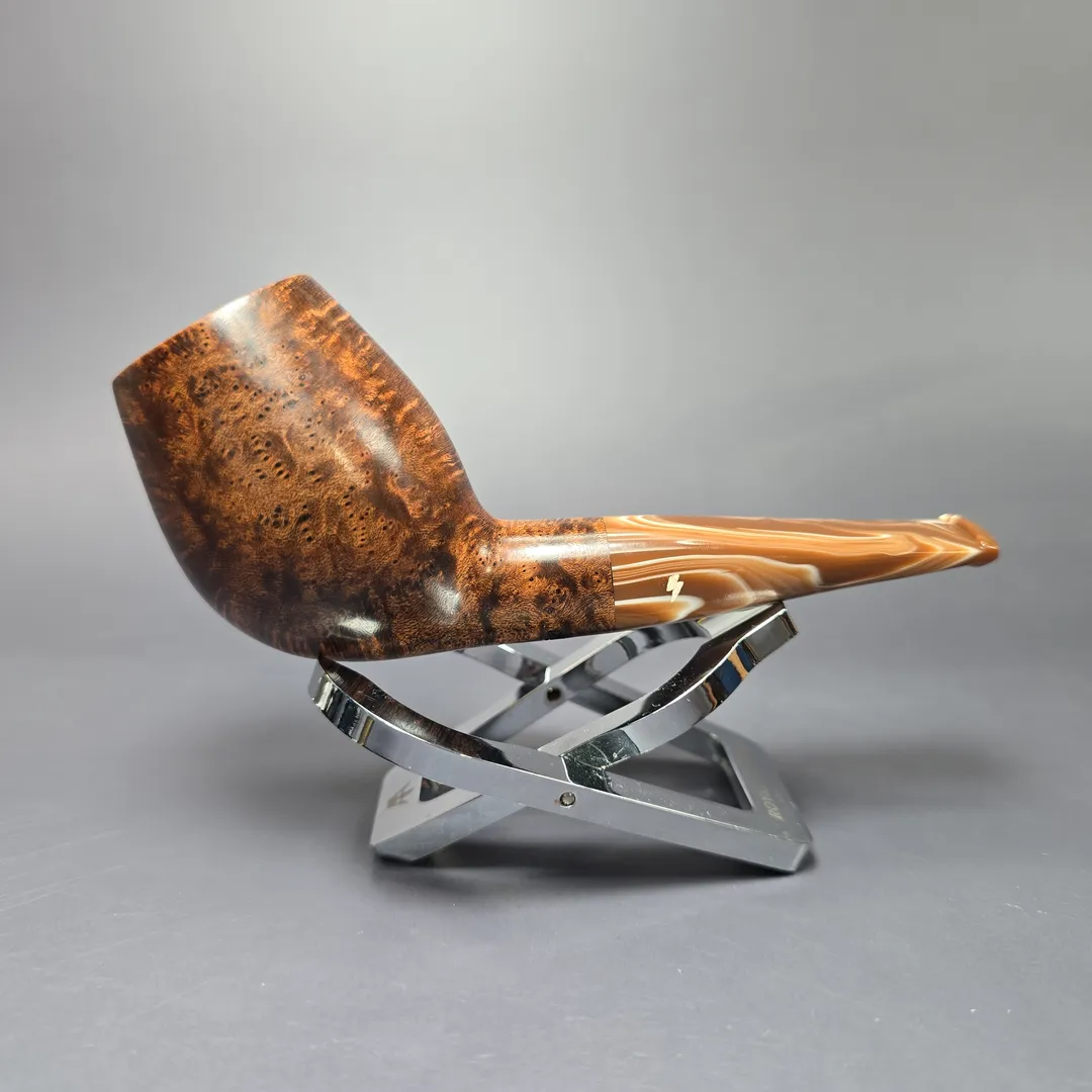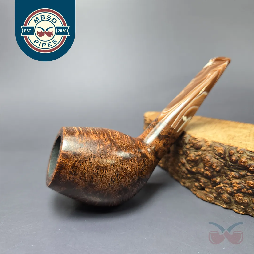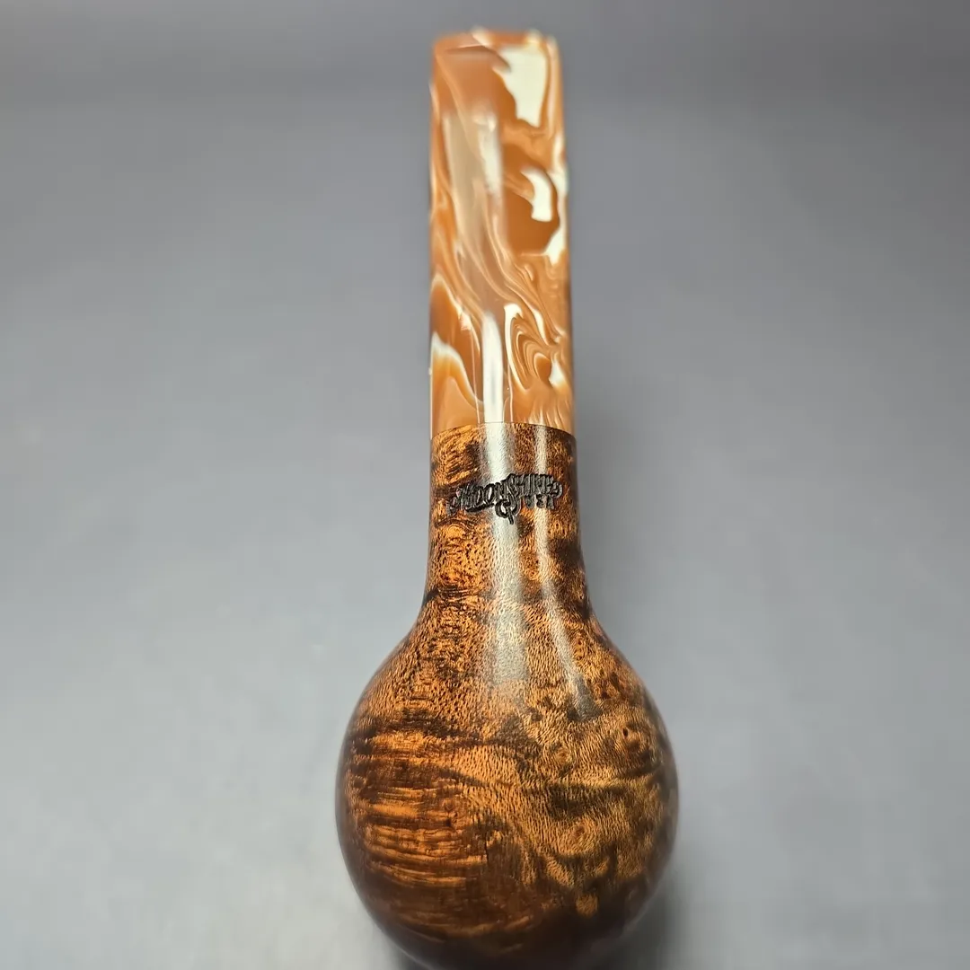 Given that Moonshine’s portfolio is comprised almost wholly of shorter, pocket-friendly pieces, the Devil Anse is a shape that suits the brand more than almost any other. But while Moonshine does offer a traditional Devil Anse, they also offer a slightly different rendition that also ties neatly into their American artisan heritage: the MS03 “Deviled Egg.” Combining the plump proportions of a Danish egg with the stubby and distinctly canted form of the Anse, the Deviled Egg has, quite understandably, become a highly popular, signature Moonshine shape since its debut. This one is dressed in the workshop’s house Dark Smooth contrast finish and paired with a coffee-swirl acrylic stem.