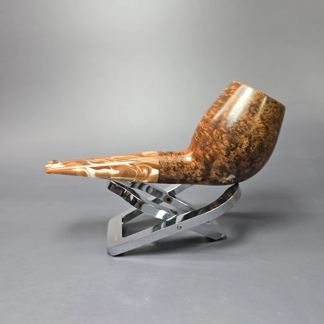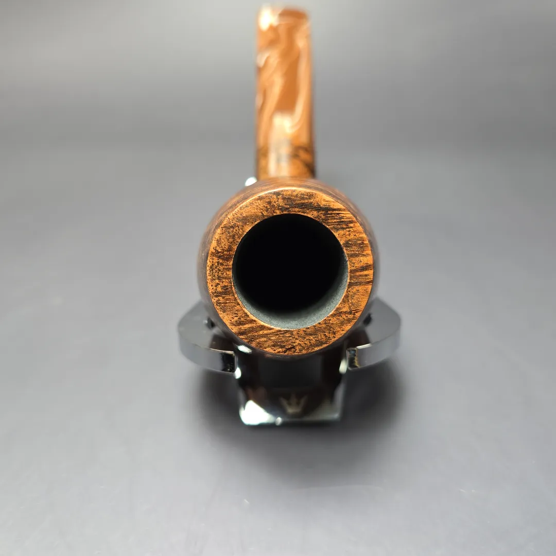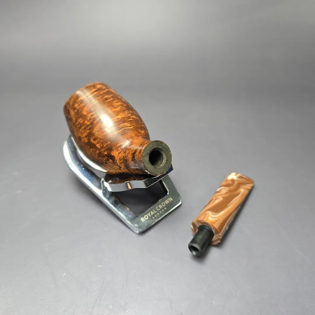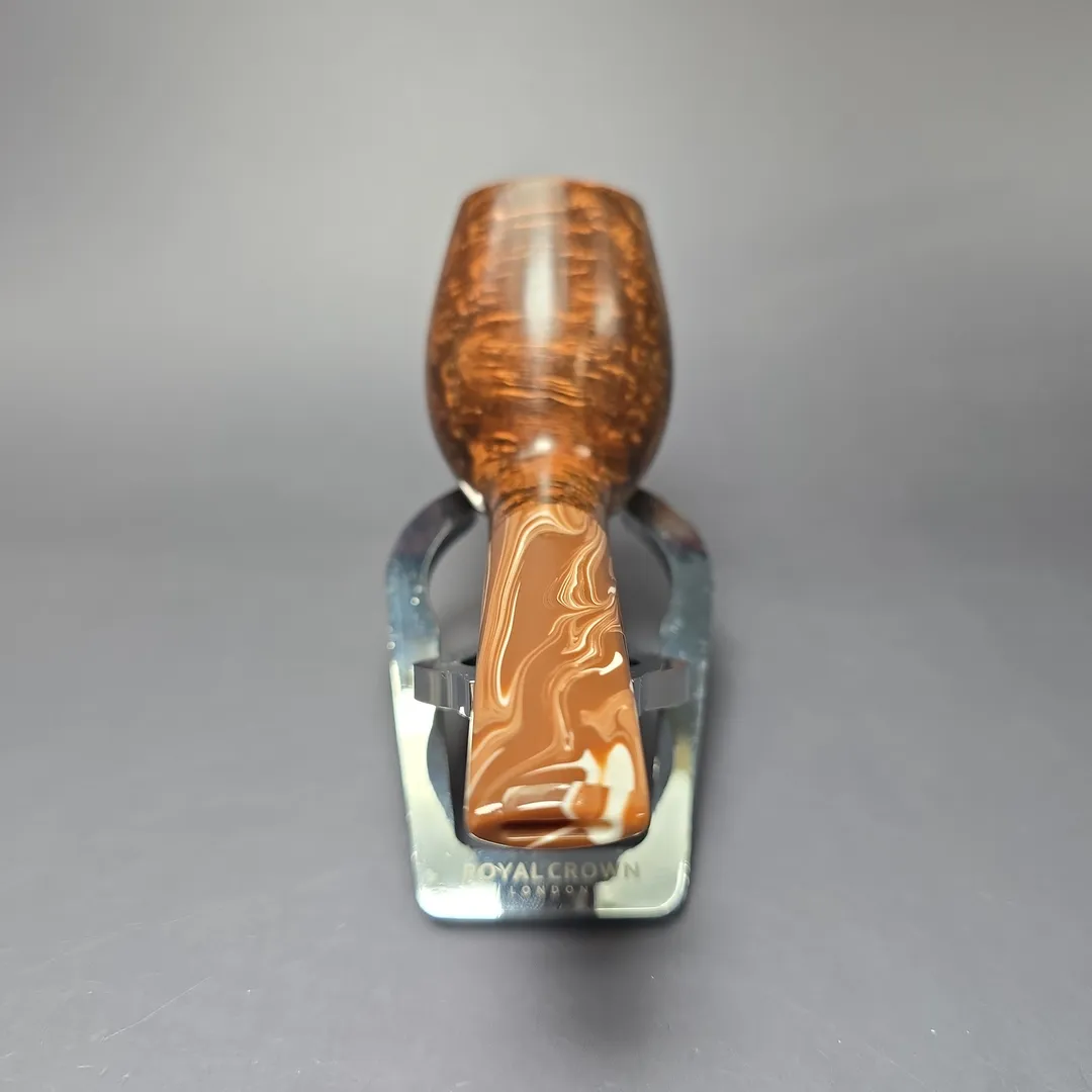 Given that Moonshine’s portfolio is comprised almost wholly of shorter, pocket-friendly pieces, the Devil Anse is a shape that suits the brand more than almost any other. But while Moonshine does offer a traditional Devil Anse, they also offer a slightly different rendition that also ties neatly into their American artisan heritage: the MS03 “Deviled Egg.” Combining the plump proportions of a Danish egg with the stubby and distinctly canted form of the Anse, the Deviled Egg has, quite understandably, become a highly popular, signature Moonshine shape since its debut. This one is dressed in the workshop’s house Dark Smooth contrast finish and paired with a coffee-swirl acrylic stem.