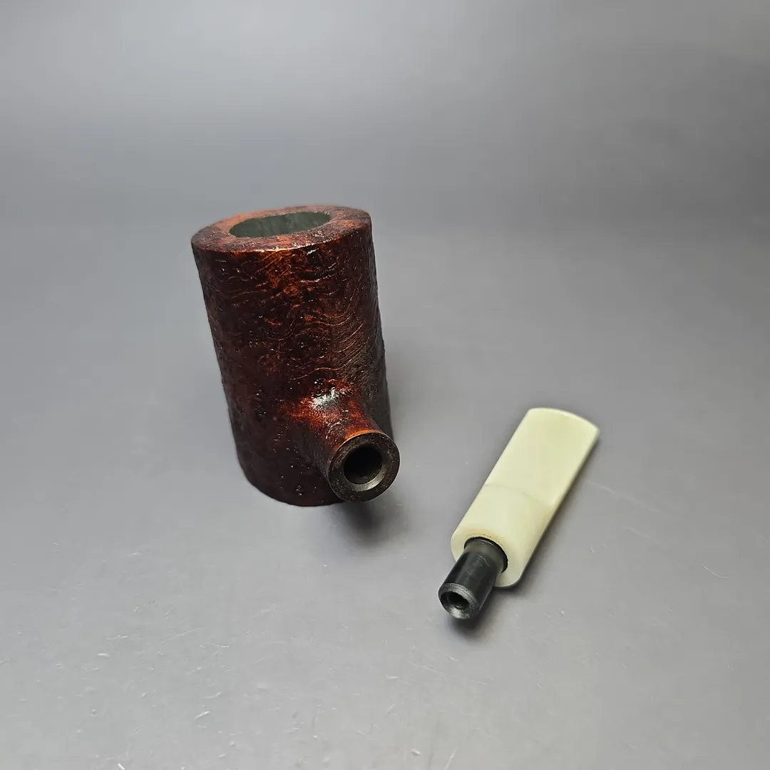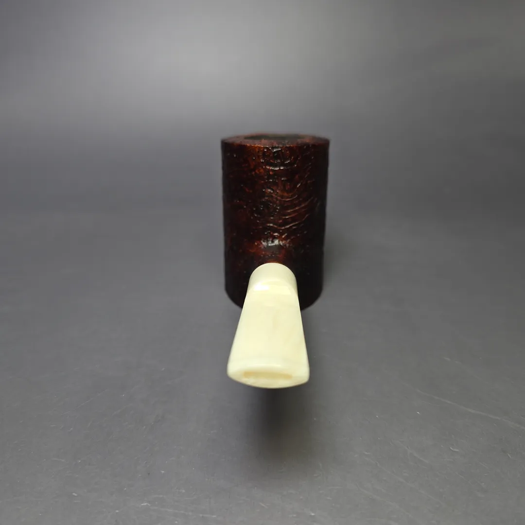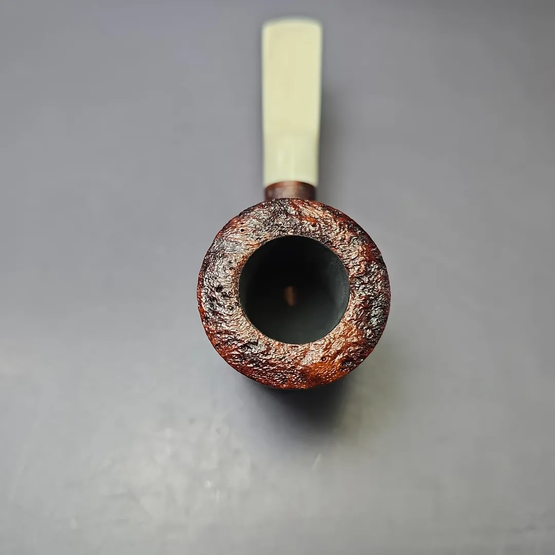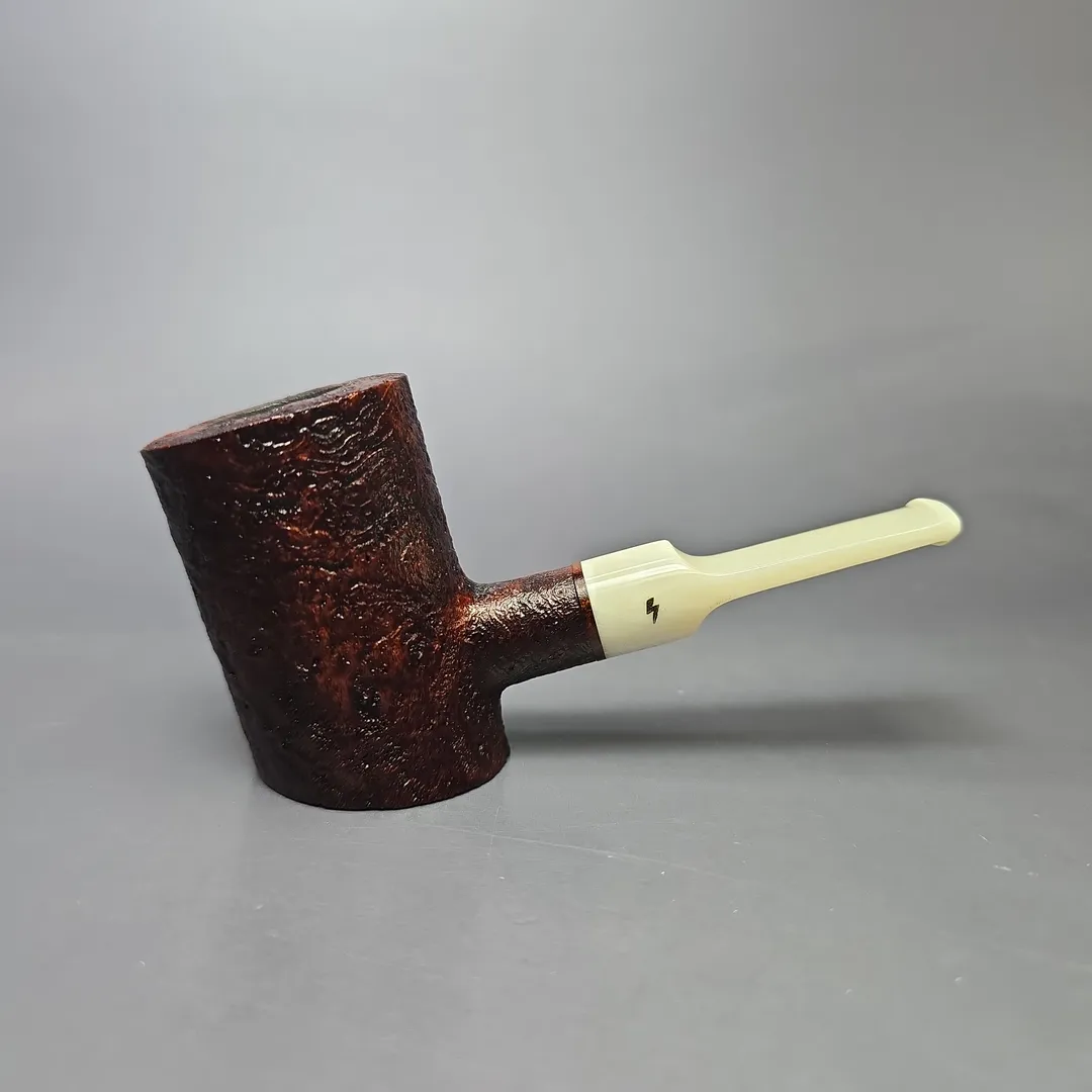 The MS06 “Stoker” is one of two poker shapes offered by Moonshine, being the even stubbier brother to the MS01 Patriot. A stout and sturdy sitter, it is the ideal traveling companion for a pipe smoker on the go, fitting easily into one’s pocket and being a reliable sitter. This one is dressed in Moonshine’s house, slight contrast Leather Sandblast and paired with an ivory-like white acrylic stem.