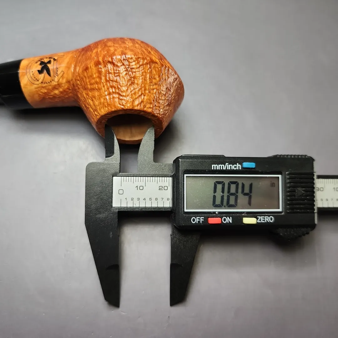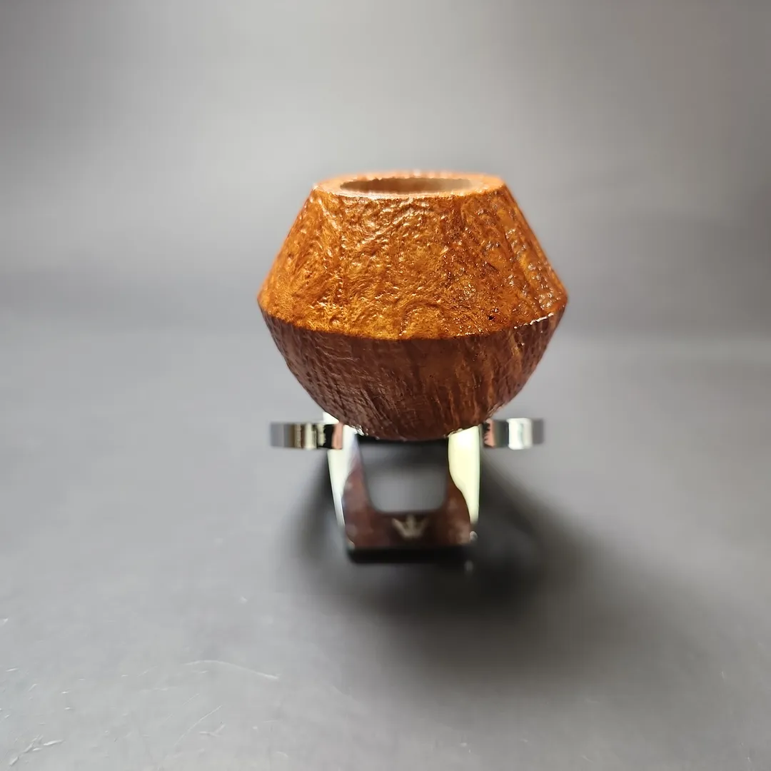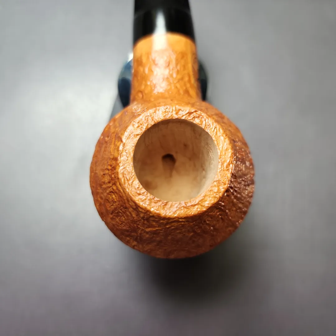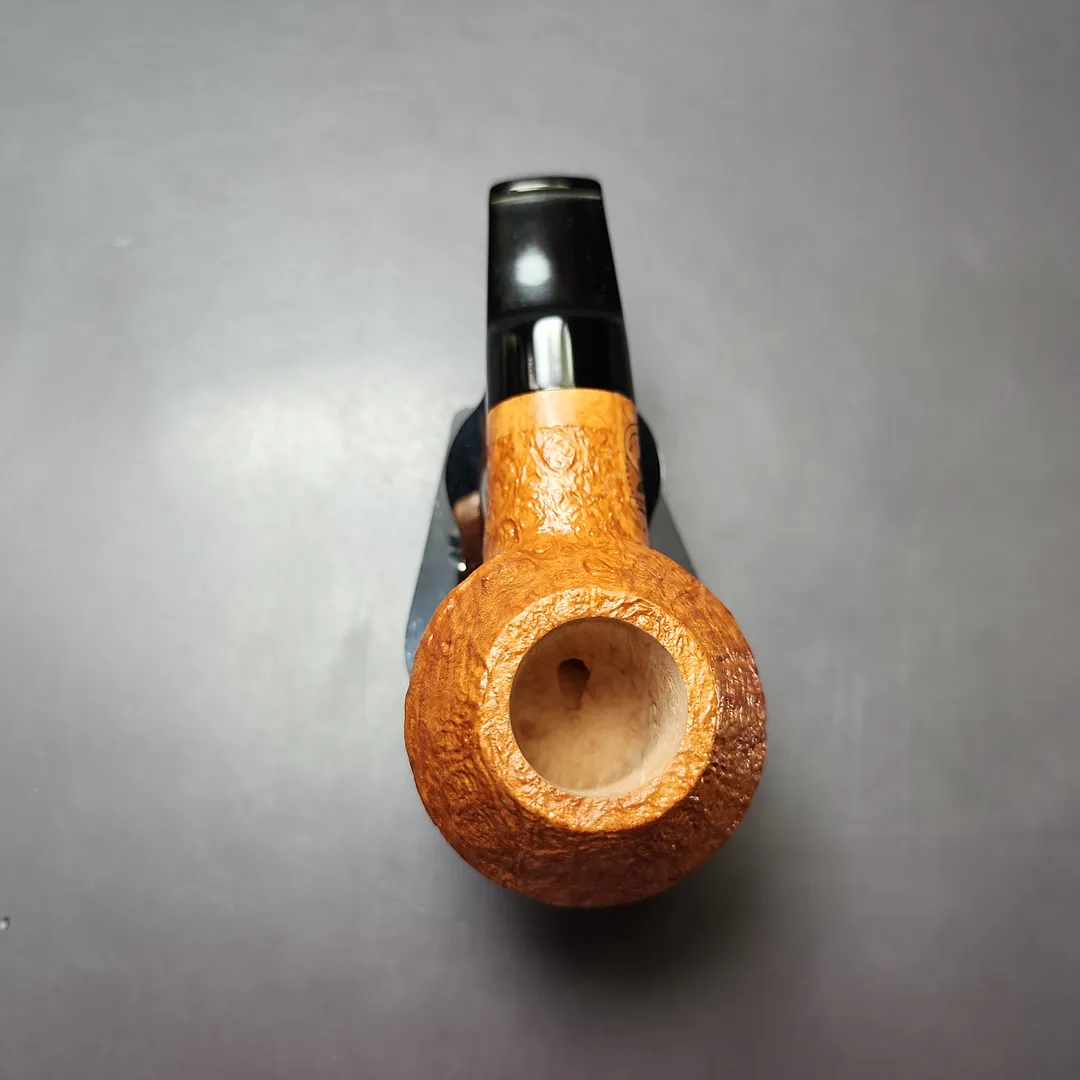 This one looks to be a slightly special edition of the BlackJack, having been made for the 10th anniversary of the brand. As is quite typical for BlackJacks, it’s a decidedly stubby piece, taking the form of a nosewarmer-length “bullcap” Rhodesian. Unlike most other BlackJacks, this one wears a tan sandblast, bringing its briar patterns into much more noticeable relief.