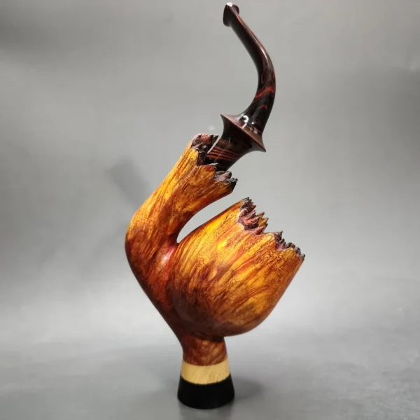 Mutcat pipes are made by Mutcat Cat, an Indonesian artisan residing in its northeastern Java province. A pipe-maker for many years, and a pipe-smoker for even longer, Mutcat’s pipes are frequently innovative in their use of alternative, home-grown materials and elaborate forms and finishes. This is not only because of a desire to offer pipe-smokers something new and unique, but because of Mutcat’s own experiences as one. Living in a tropical climate, Mutcat seeks to find novel approaches to pipe construction that can provide a cool, dry smoke whatever the weather.