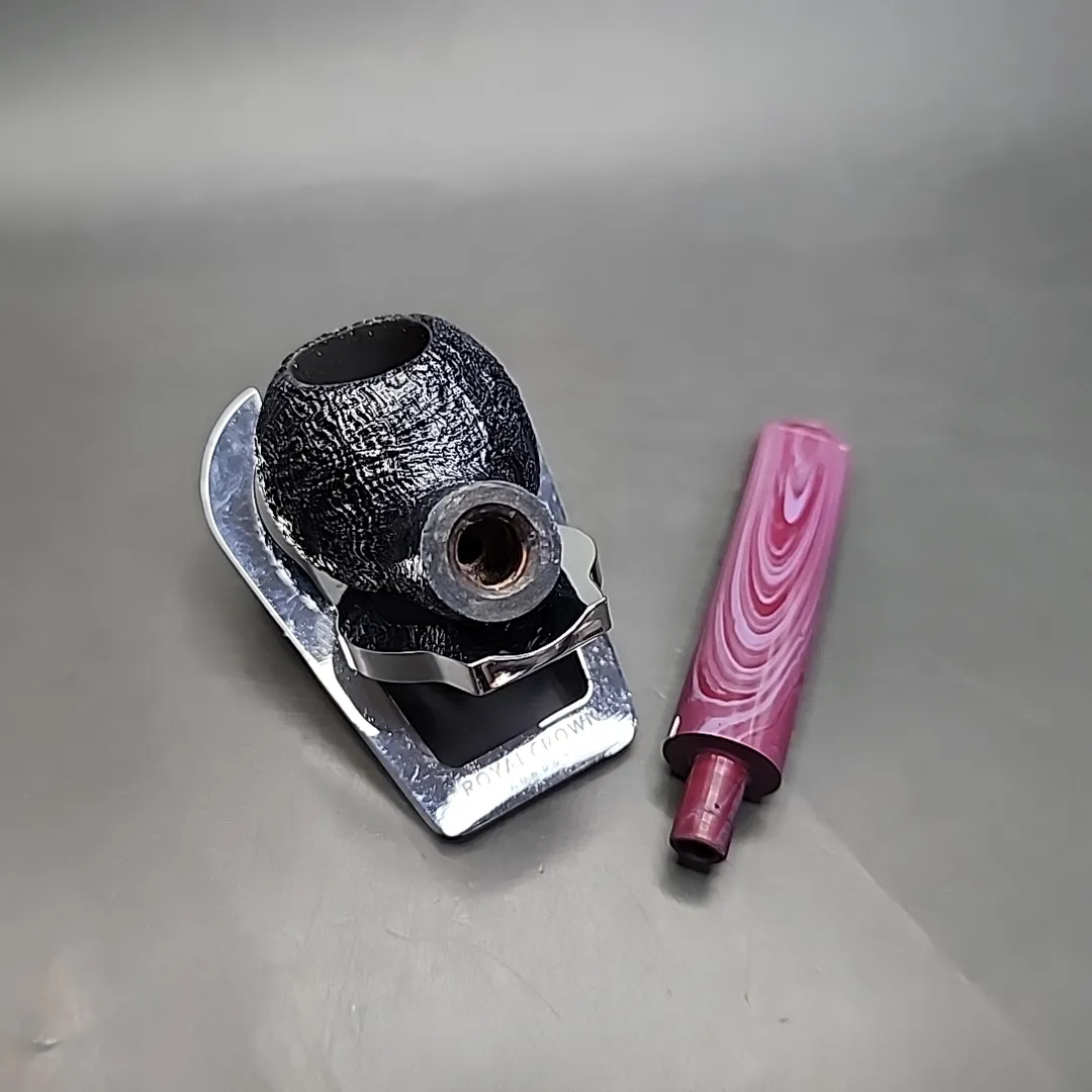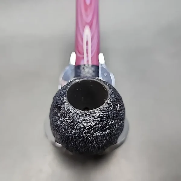This year, I was particularly pleased that MBSD was the first vendor to carry Nathan Armentrout’s new ‘Asteroid’ finish pipes. They sold very quickly, so of course I asked if Nathan would send us more. Regarding the finish itself: while most pipe-makers will try to craft and finish a sandblasted pipe so that the natural patterns of the briar wrap around the bowl in tight, horizontal rings – what’s commonly known as ring grain – Nathan has instead focused on what can be done with both grain rings and bird’s-eye figures, which are often neglected or avoided in sandblasted pipes. This way, in Nathan’s words, the blast looks like the ‘cratered terrain of an asteroid,’ which, fittingly, Nathan pairs with unconventionally stony stains. This Asteroid is a fairly traditional author shape – Nathan refers to it as more like a ‘comet,’ given the soaring plasma trail its bright ebonite stem mimics.