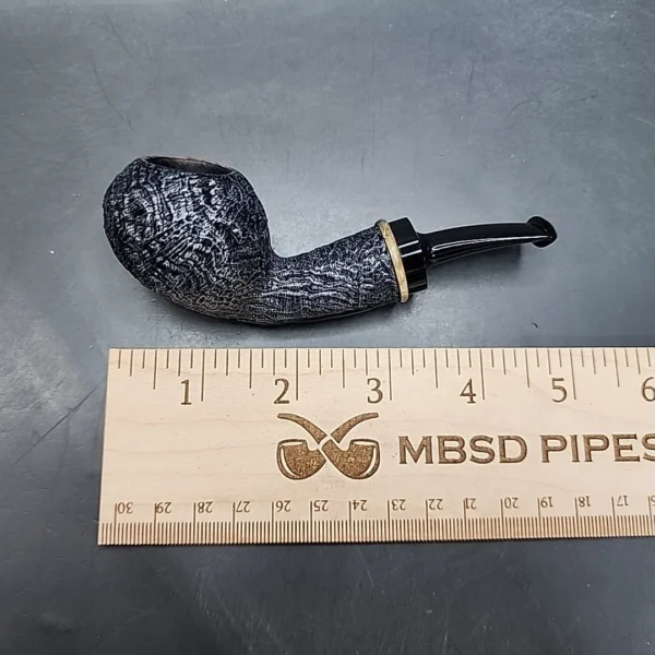 I was really excited to receive this pipe from Nathan. This year, he debuted a new, signature finish he had been working on, and this is the result. It’s an approach to sandblasting and staining, but one that is a little different from the norm. While most pipe-makers will try to craft and finish a sandblasted pipe so that the natural patterns of the briar wrap around the bowl in tight, horizontal rings – what’s commonly known as ring grain – Nathan has instead focused on what can be done with both grain rings and bird’s-eye figures, which are often neglected or avoided in sandblasted pipes. This way, in Nathan’s words, the blast looks like the ‘cratered terrain of an asteroid,’ which, fittingly, Nathan pairs with unconventionally stony stains. I think it’s fantastic. The choice of stain color on its own is really novel, but combined with the blasting approach it creates a really striking effect.