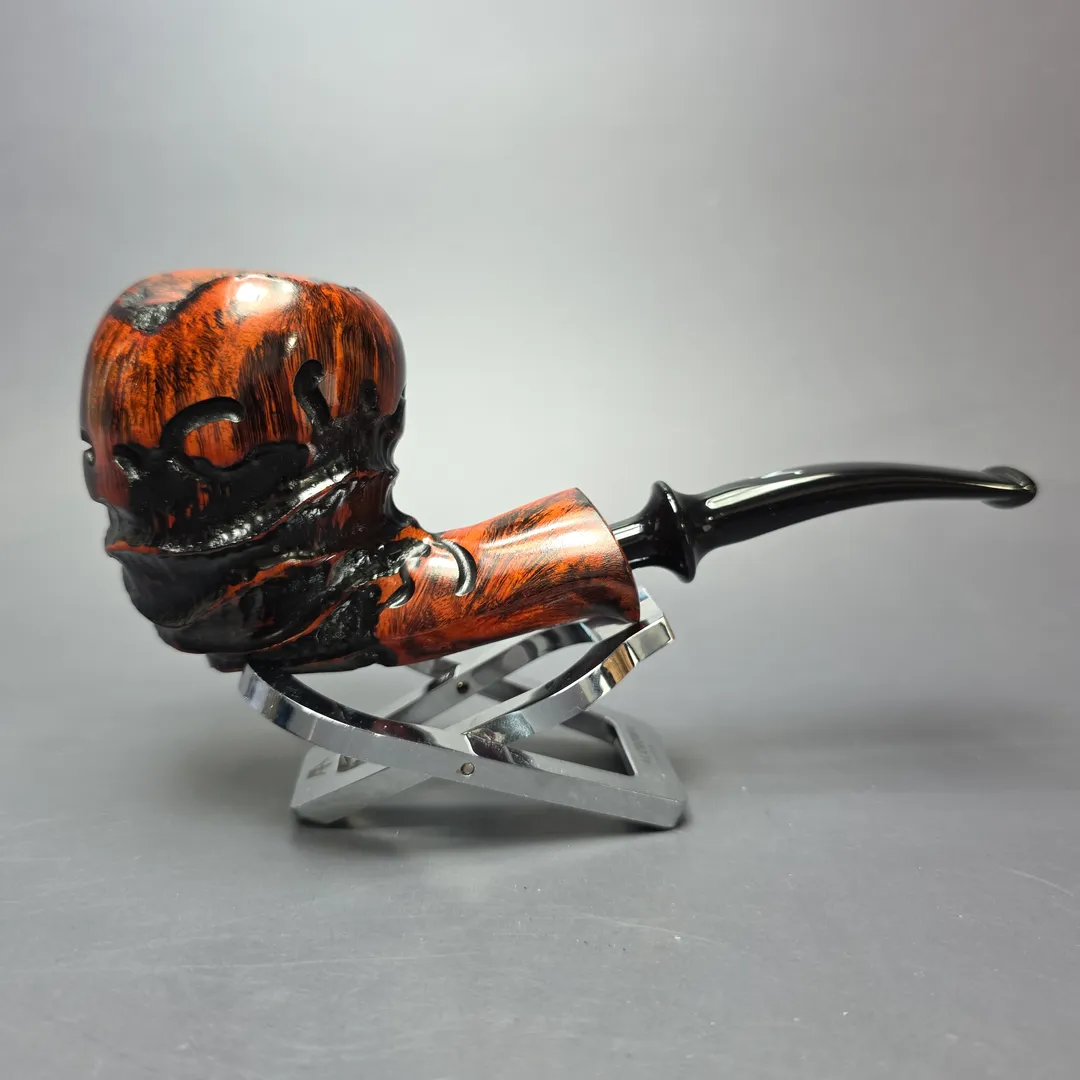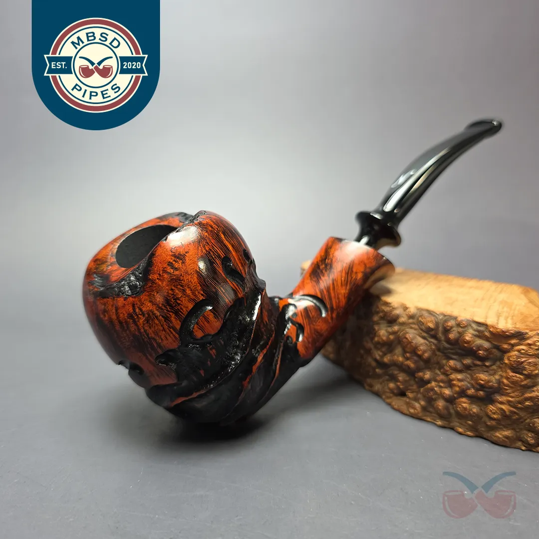 Freehand pipes are generally known for their rugged, naturalistic aesthetic. Erik Nording’s Abstract series of freehands aims to push that even further. Employing a mixed finish and a combination different rustication styles, these pipes given an even more distinctive depth and freedom of form. The pipes are then treated with a contrast stain that accentuates the remaining smooth sections of the briar.