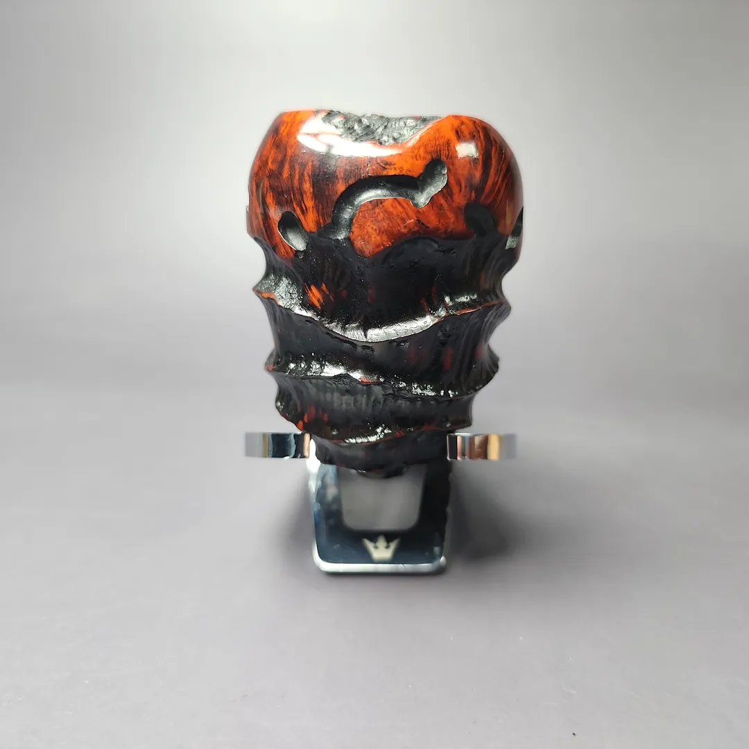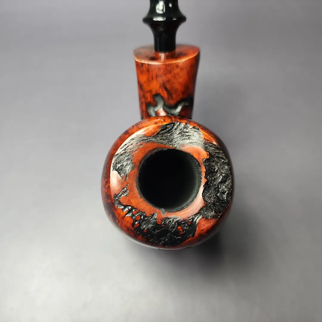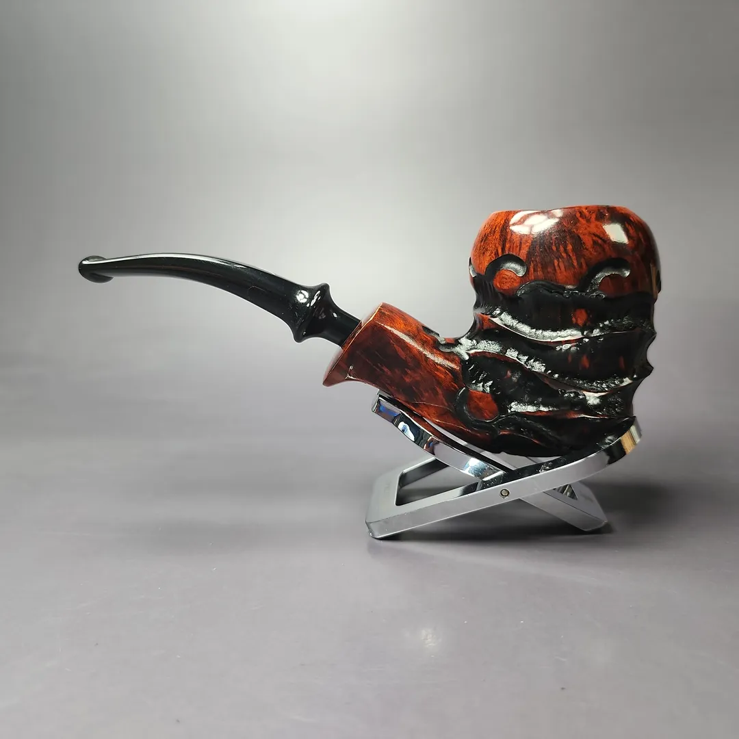 Freehand pipes are generally known for their rugged, naturalistic aesthetic. Erik Nording’s Abstract series of freehands aims to push that even further. Employing a mixed finish and a combination different rustication styles, these pipes given an even more distinctive depth and freedom of form. The pipes are then treated with a contrast stain that accentuates the remaining smooth sections of the briar.