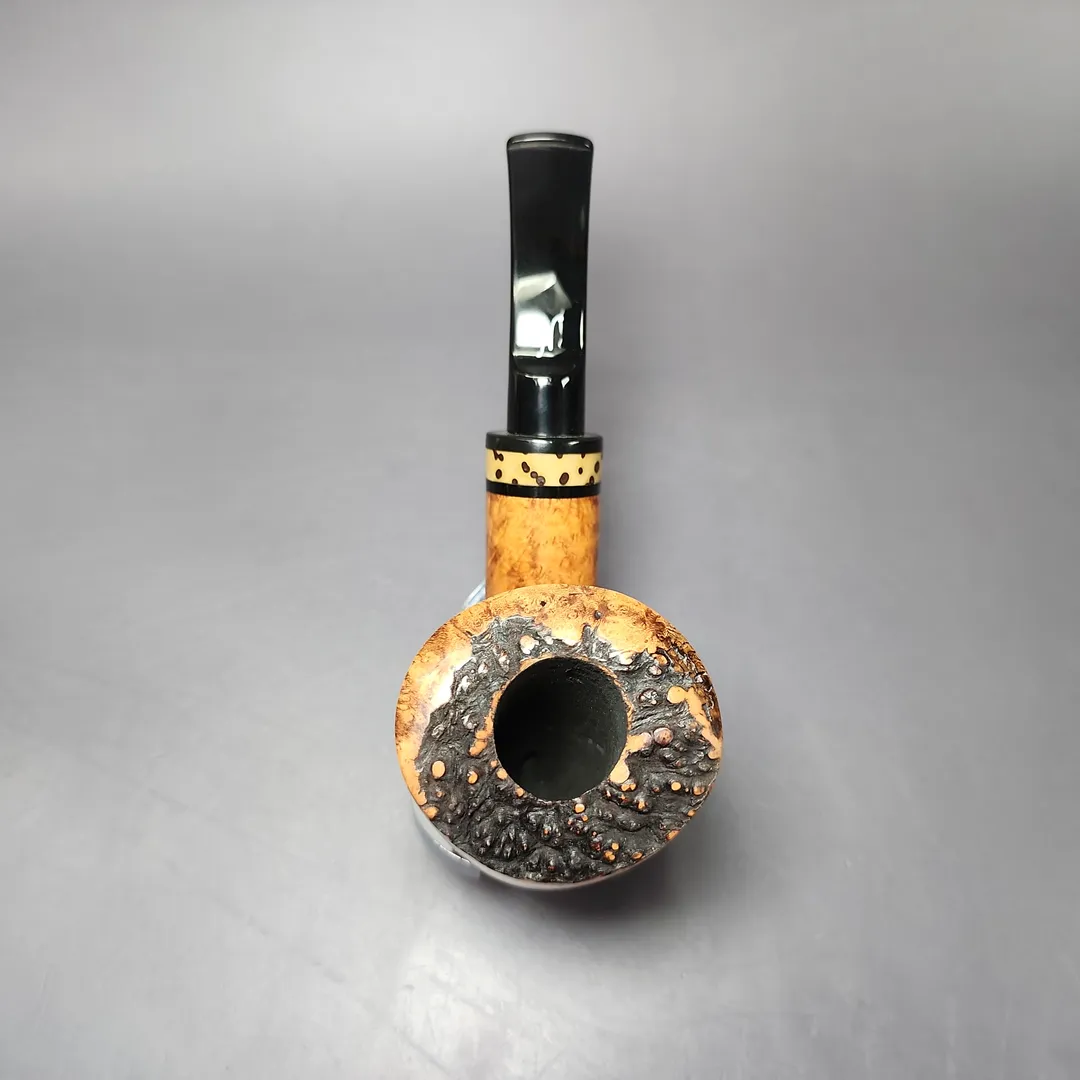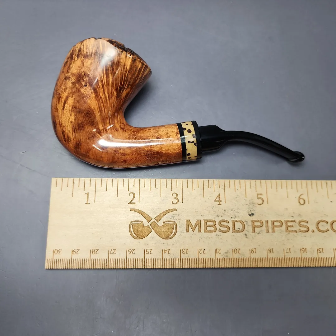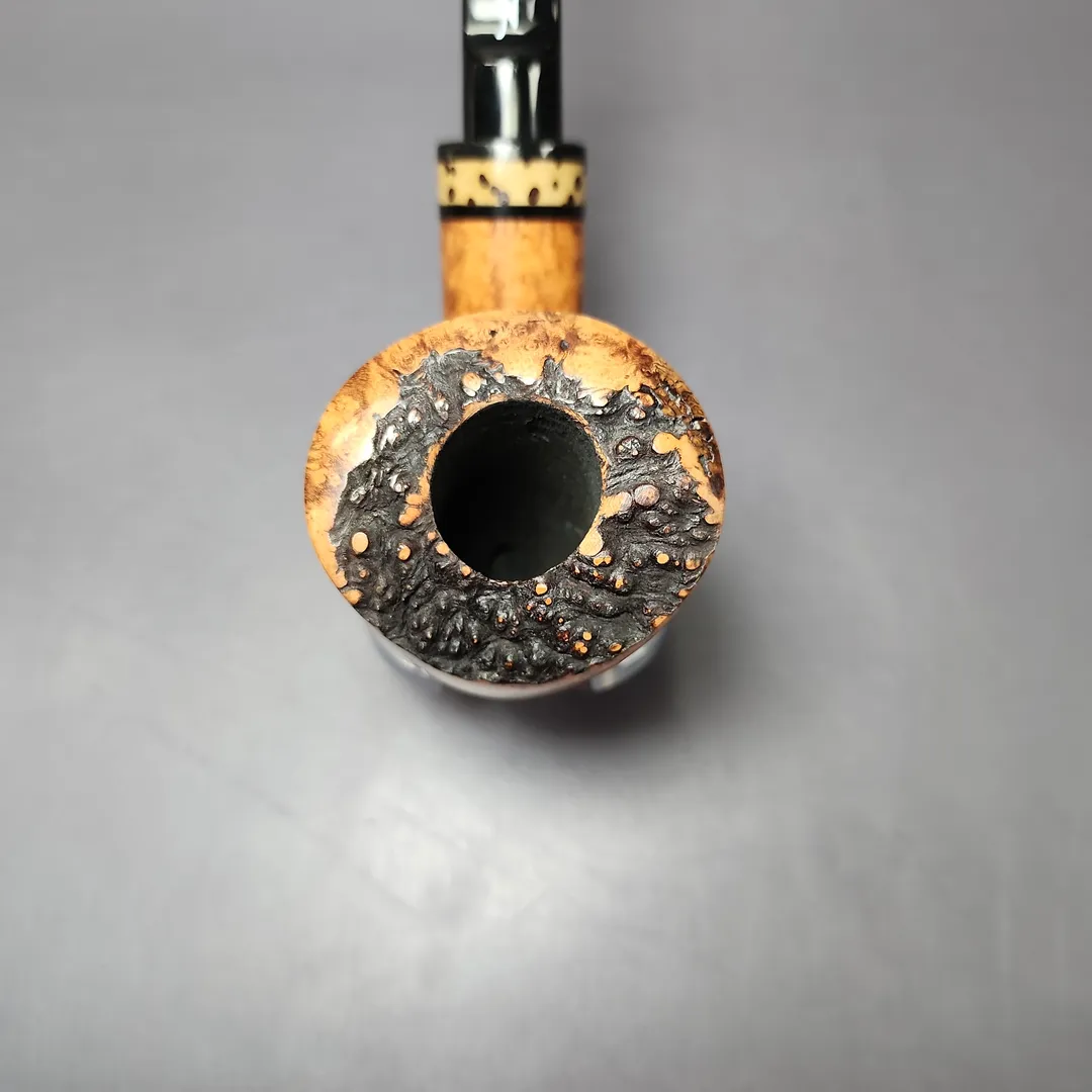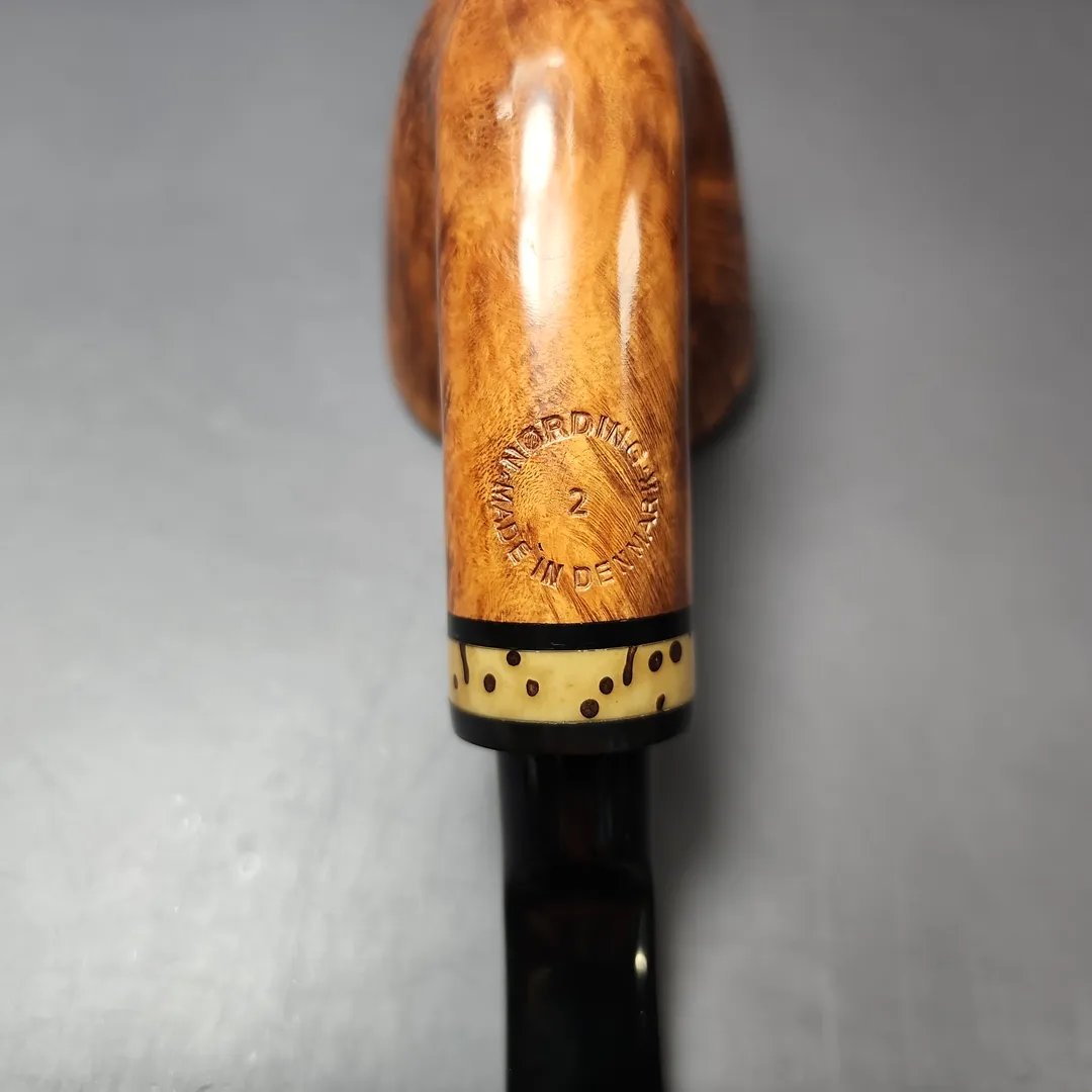 Nording’s Extra series is a relatively recent one, comprised of freehands that are, put simply, a little bit “extra,” and this is in a number of senses. For one thing, the grain on them is a cut above almost all other Nording freehand pipes; equally significant, though, is that Extra series pipes feature distinctive stem work and adornments, from bamboo, to exotic hardwoods, to the polymerized seeds of tropical plants. This grade 2 example would look to be an example of the latter, adding a further, naturalistic element to an already highly naturalistic design genre.