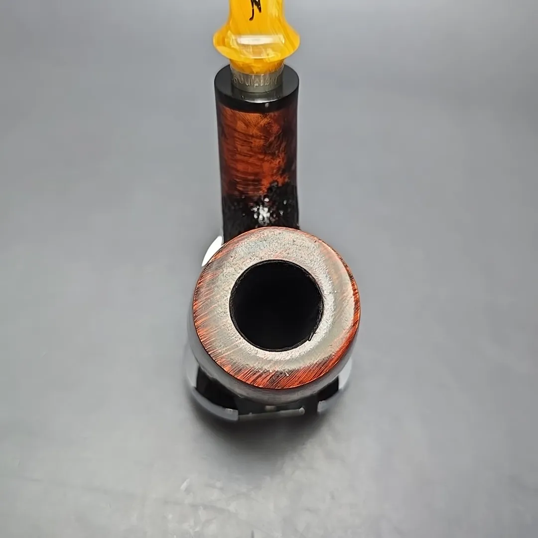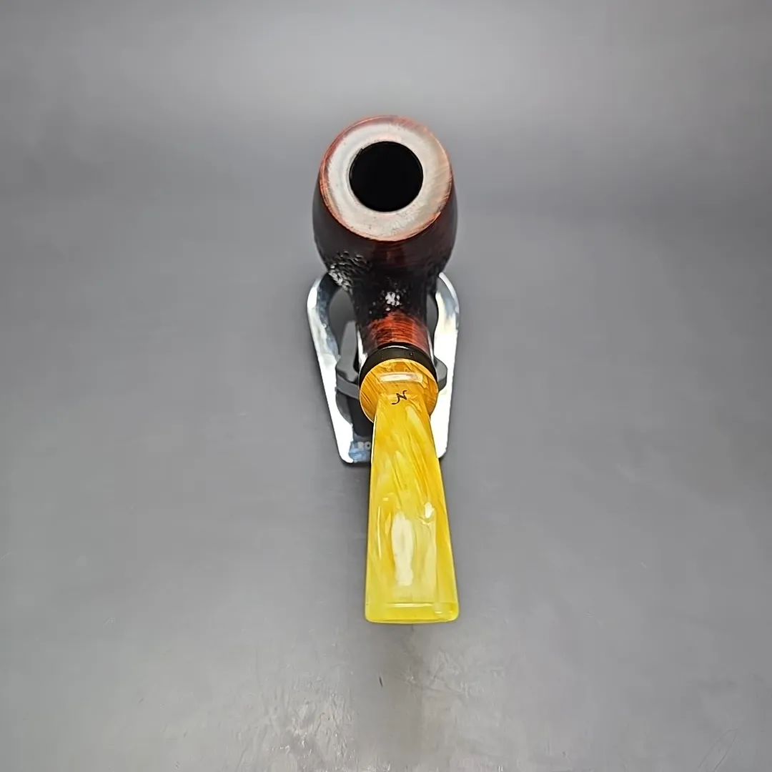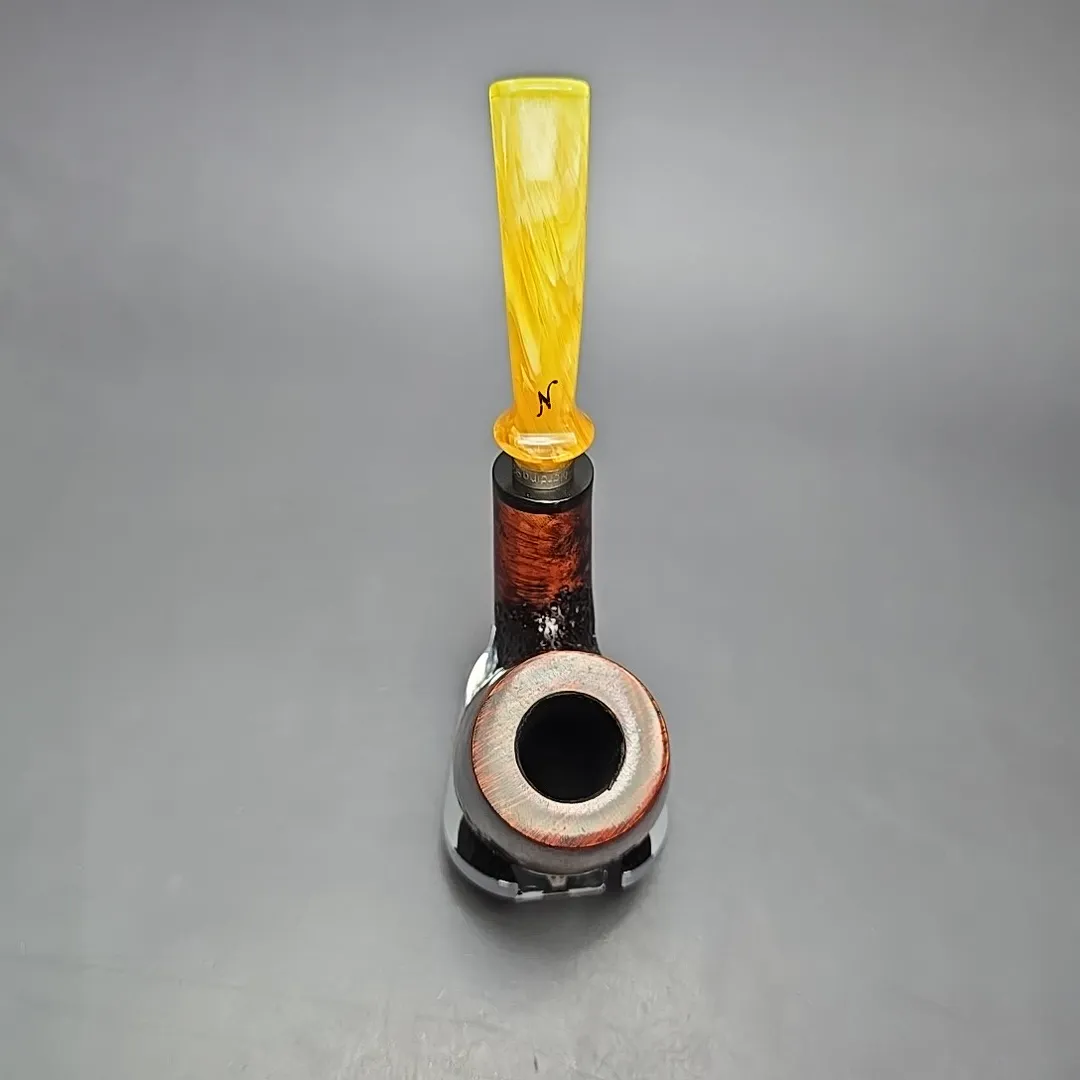 Though Nording’s career has been defined both by his pioneering of the “Danish fancy” freehand genre and by his creation of bold, modernist Scandinavian designs, a closer look at his portfolio over the last six decades reveals a profound versatility to his approach. From billiards to horns, to minimalist pokers, to shapes that, as of yet, don’t have a name, he’s done it all. I’ve even seen a Nording rendition of the iconic Dunhill LC, come to think of it. It should come as no surprise, then, that Erik would also explore the “house pipe” genre, i.e., a large, easy sipper with a chamber capacity that may well provide a couple of hours of enjoyment if smoked at a leisurely pace, and with a flake, coin, or plug cut. The Giant Classic is exactly that, taking the form of a very large, full-bent billiard, seen here dressed in a mixed finish of copious contrasts, and fitted with a silver collared, amber-toned acrylic mouthpiece.