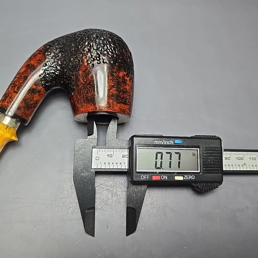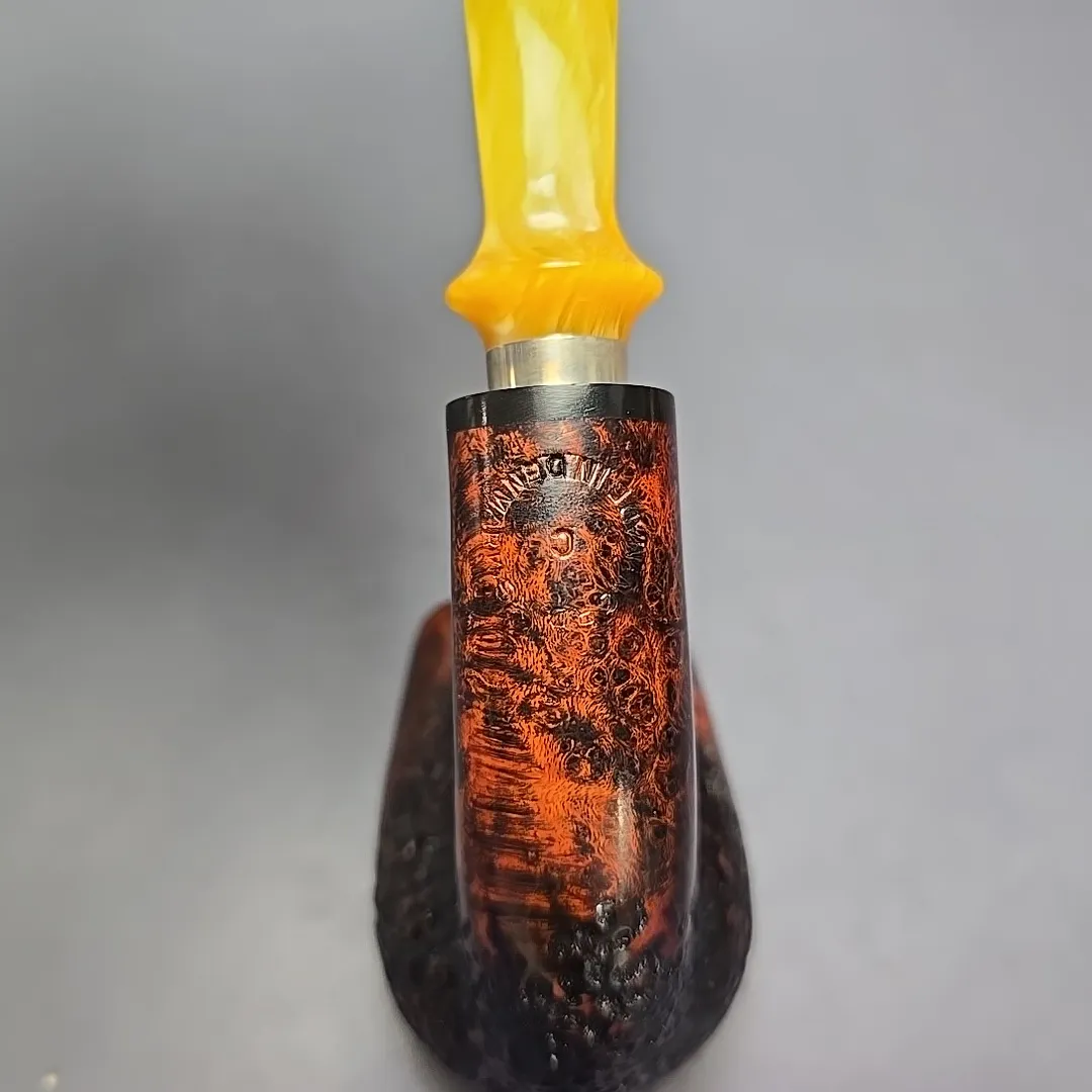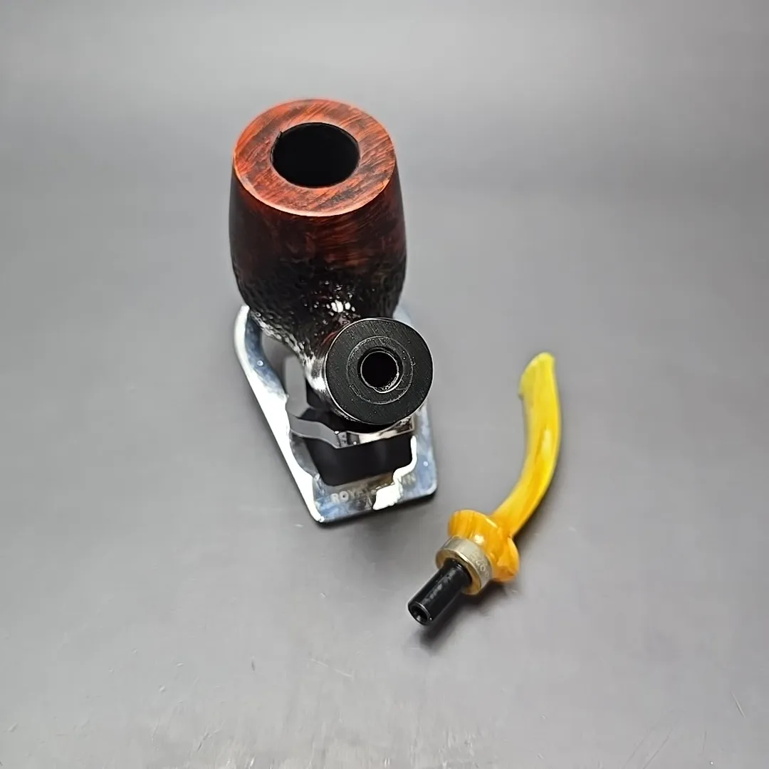 Though Nording’s career has been defined both by his pioneering of the “Danish fancy” freehand genre and by his creation of bold, modernist Scandinavian designs, a closer look at his portfolio over the last six decades reveals a profound versatility to his approach. From billiards to horns, to minimalist pokers, to shapes that, as of yet, don’t have a name, he’s done it all. I’ve even seen a Nording rendition of the iconic Dunhill LC, come to think of it. It should come as no surprise, then, that Erik would also explore the “house pipe” genre, i.e., a large, easy sipper with a chamber capacity that may well provide a couple of hours of enjoyment if smoked at a leisurely pace, and with a flake, coin, or plug cut. The Giant Classic is exactly that, taking the form of a very large, full-bent billiard, seen here dressed in a mixed finish of copious contrasts, and fitted with a silver collared, amber-toned acrylic mouthpiece.
