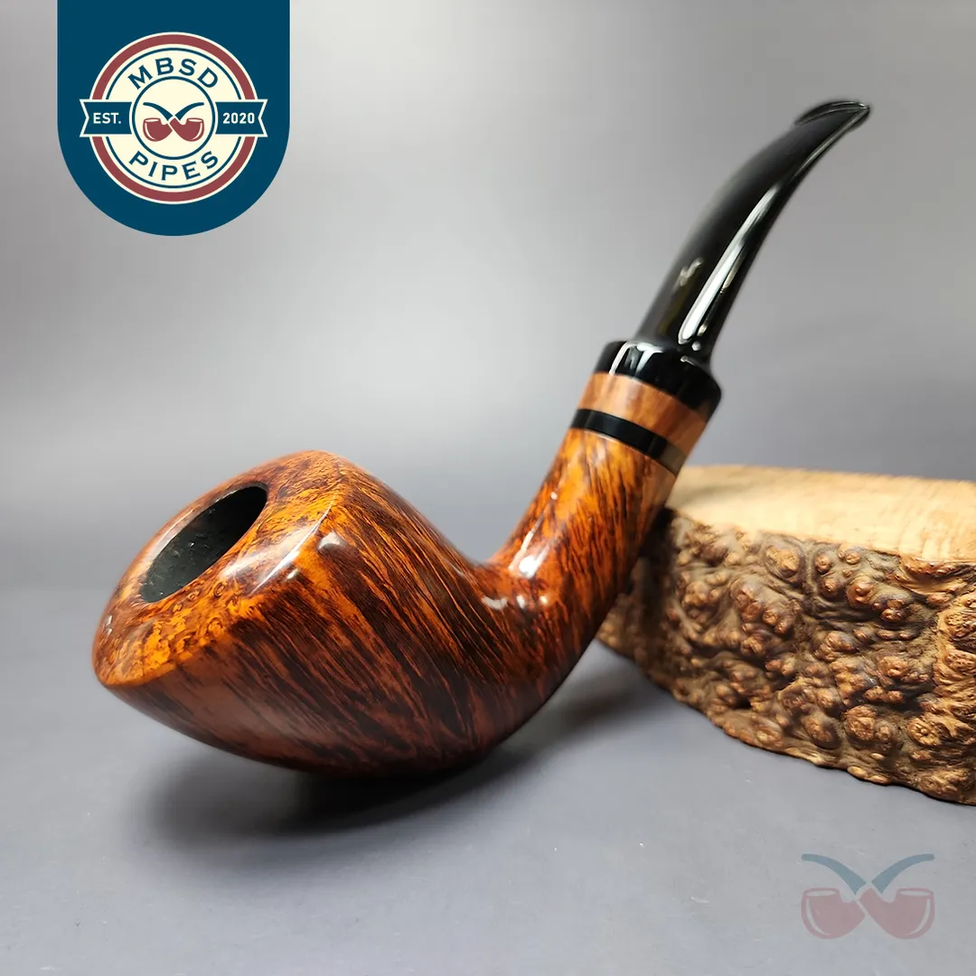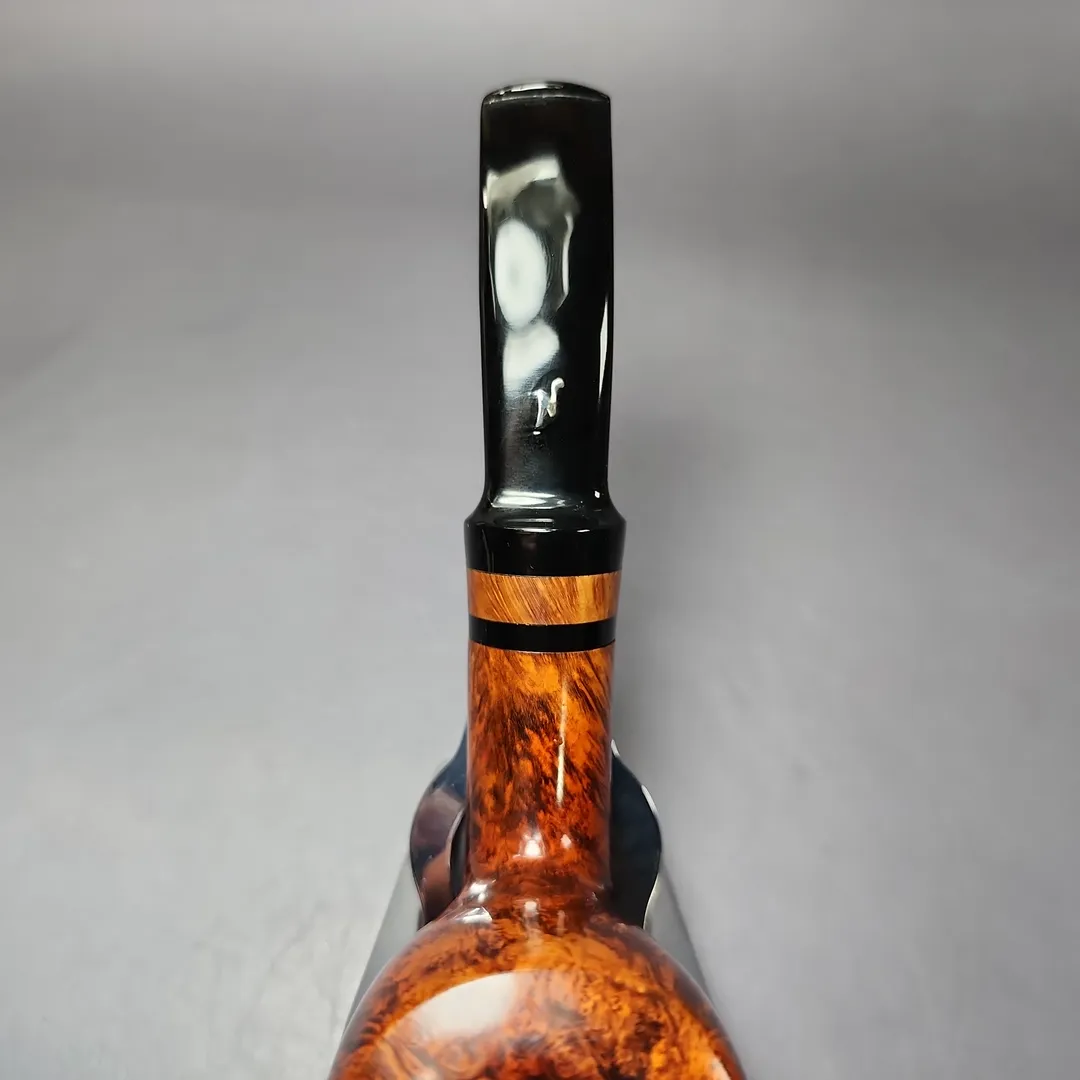 Since leaving his early partnership with Aage Skovbo and the SON make, Erik Nording has operated an increasingly large workshop, in which apprentice and seasoned carvers have aided in the production of Nording pipes. In recent decades, as Erik Nording himself has gotten older, his involvement in the production of many Nording lines and series has decreased, but there is one series that remained—until quite recently—entirely Erik’s own: the Hand Made. Erik himself is in the process of retiring, meaning the Hand Made is all but gone, but while he was still working, each pipe in the Hand Made series was made, from start to finish, by his own hand. As one might expect given Erik’s history and wealth of pipe making experience, these pipes were the pinnacle of the Nording company’s output, and will likely remain so, even after Erik wraps up his departure from pipe making. This one, a highly respectable grade 15, is a large, very Danish Dublin shape, with a contrast finish over copious flame grain, and a briar accent inlaid in the pipe’s stem.