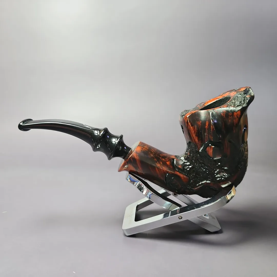 Freehand pipes are generally known for their rugged, naturalistic aesthetic, and this one is no different. In fact, it’s one of the most rugged freehands I’ve yet seen, though this isn’t surprising given that it comes from Denmark’s greatest living master of the genre, Erik Nording. The vermiculated rustication is a nice touch, making the smooth parts of the bowl, along with their fiery grain, stand out even more.