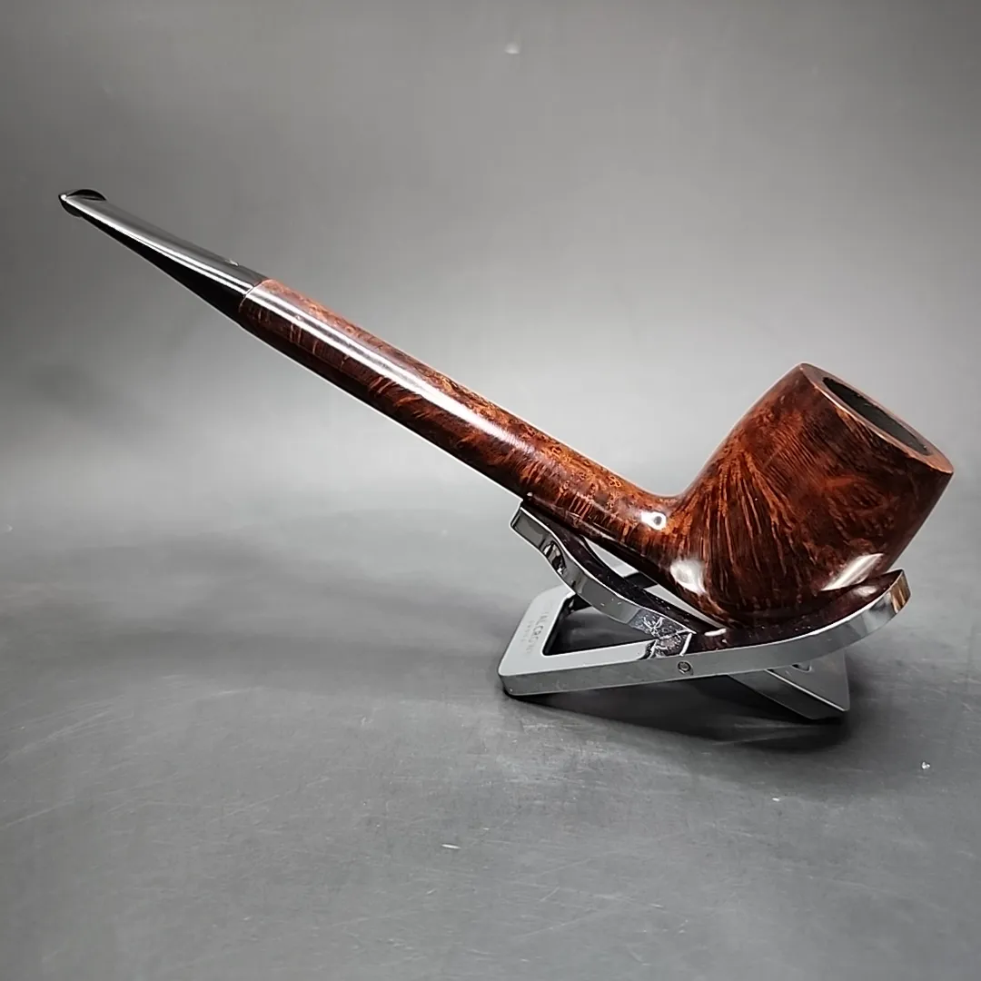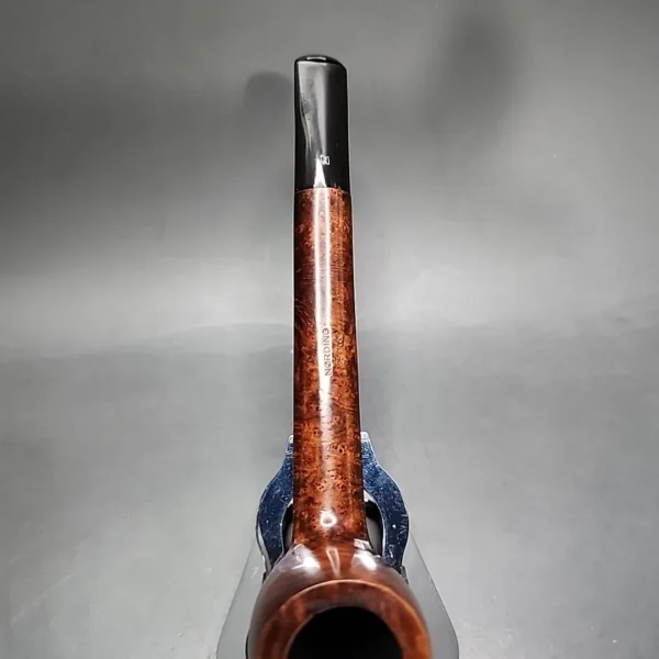 First off: no, your eyes don’t deceive you, and the included photos are correct. This is a Nording alright. But it’s not the style that first comes to mind when thinking of Nording pipes. Instead, it is a very traditional – albeit on the longer side – Canadian shape in the English-French mold. And it’s a really nice one at that, one carved to emphasize swirling cross-grain around its bowl, and a brilliant mass of bird’s-eye patterns on its shank and underside. This looks to be an older Nording, judging by the ebonite stem. 1970s/80s, perhaps?