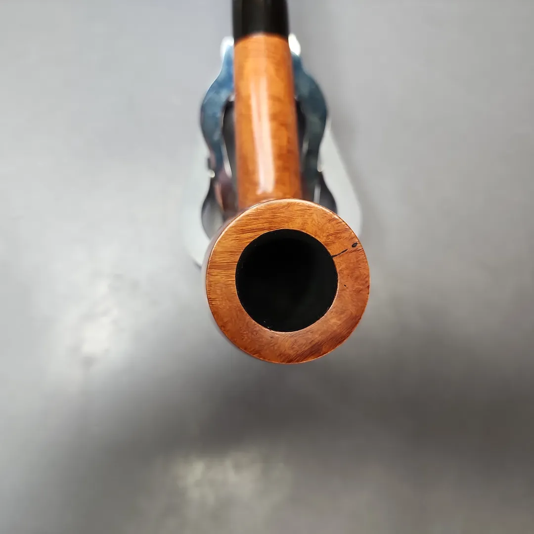 The condition is very good. Chamber slightly over-reamed, some very slight scratches on the stem, and a couple of small fills on the exterior of the bowl.