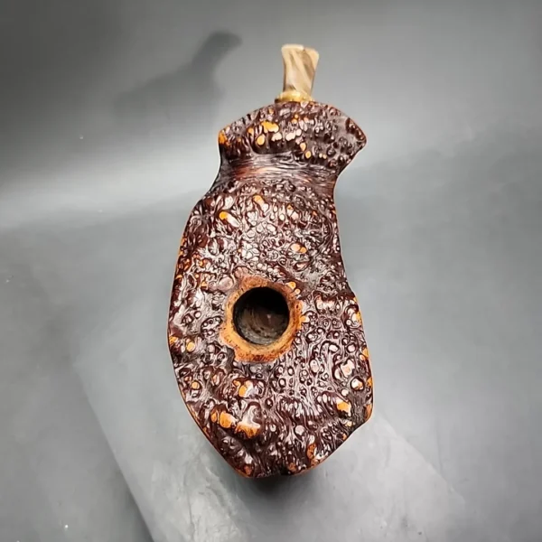 In recent years, Peder Jeppesen has divided his labors between numerous pipe project, with two of the main ones being his ‘Neerup’ pipes and his “Peder Jeppesen” pipes. Both show off Jeppesen’s playful, and often more colorful, approach to pipe-making, with the latter representing his highest-grade work. This one is an example of the latter, and is indeed the recipient of Jeppesen’s prestigious “High Grade” qualification. It is a Danish “freehand” pipe, yet its form also inclines towards the Italian “fan” shape, albeit in an inverted form. Like the fan, the pipe has been cut from the outer burl of a briar root, where the briar’s straight grain spreads out in a fan pattern before erupting into a knotty plateau; unlike the fan, the base of this Jeppesen has been smoothed over and rounded, giving it an appearance not unlike a boat’s hull. Needless to say, it is a pipe that blurs the line between art and craft. It is also exceedingly large.