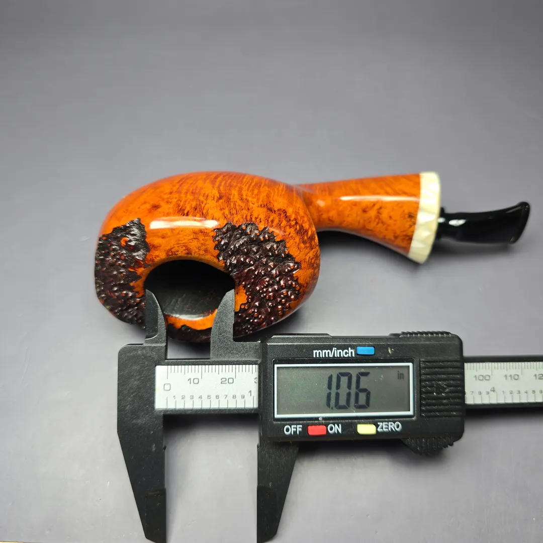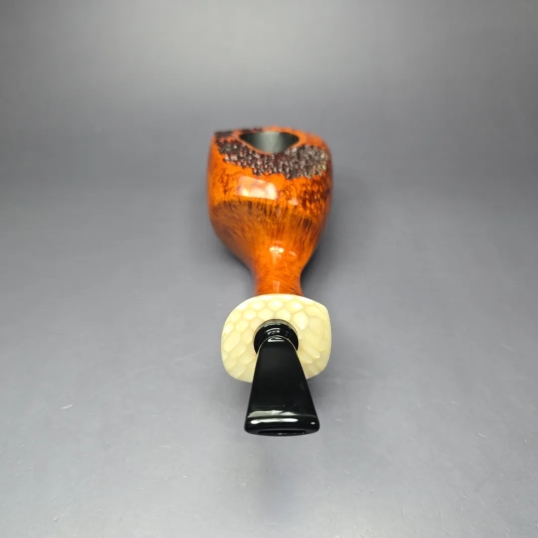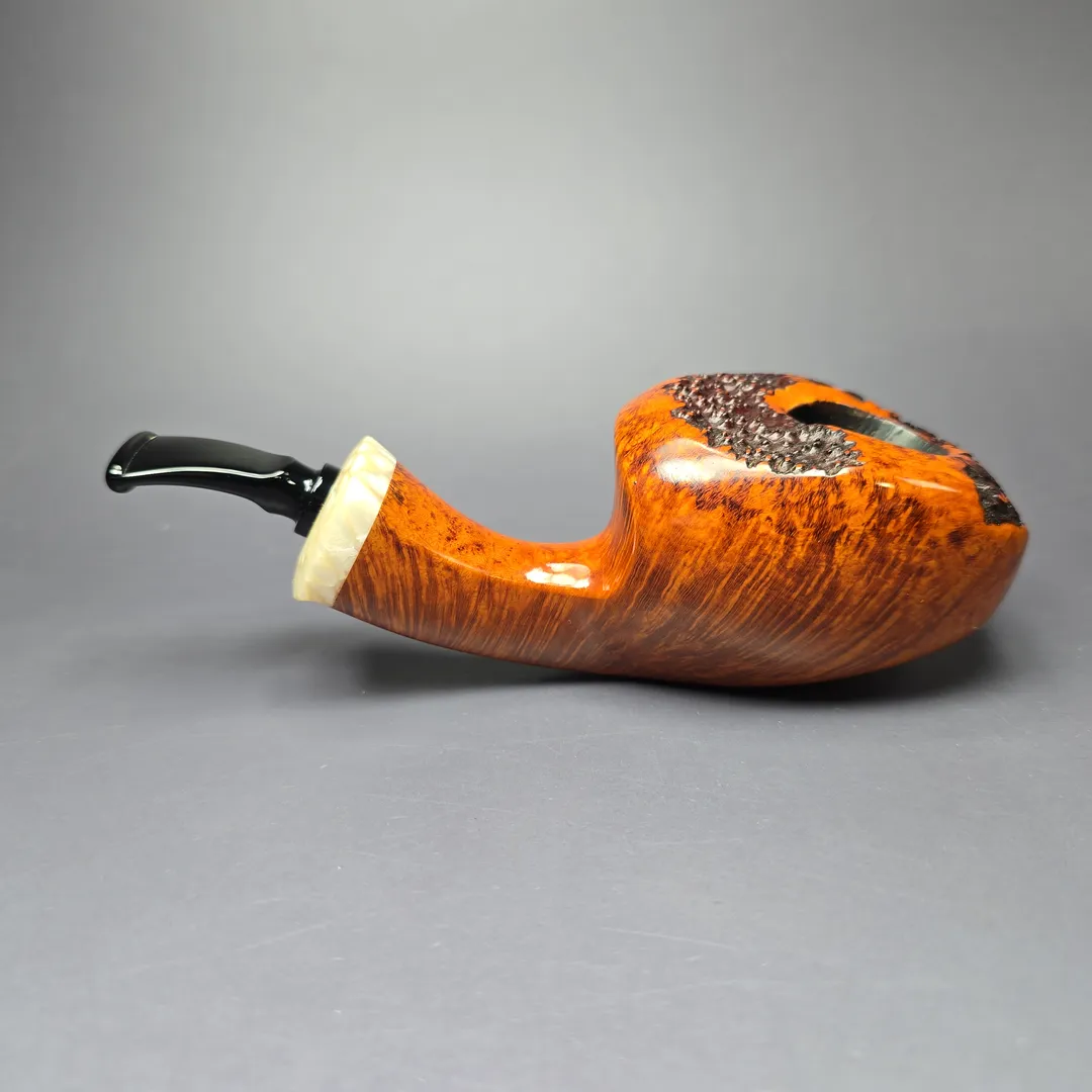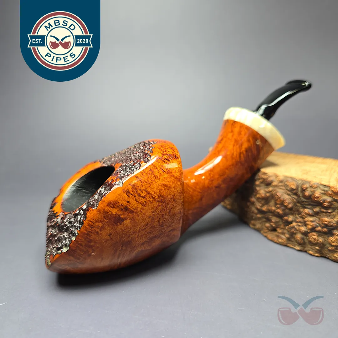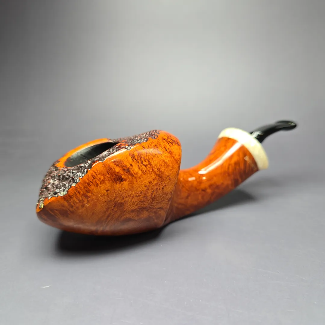 Peder Jeppesen is a Danish artisan who, with his son Noah, crafts P. Jeppesen and Neerup pipes. As is tradition in Denmark, Jeppesen got his start making pipes in the workshop of Karl Erik, and then in the workshop of Erik Nording, before going solo. Despite graduating from his apprenticeships amidst an incredibly competitive artisan scene, Jeppesen has since become one of the most prominent and successful pipe makers in both Denmark and the world. As for how he managed to accomplish this, it is likely that the distinctive nature of his designs—even against the broader backdrop of Scandinavian pipe making—has been a significant contributing factor. Blending the staple, organic forms common to Danish pipe making, such as apples, eggs, acorns, and strawberries, with unorthodox decorative elements, such as brighter color schemes, rings, and other adornments, has ensured that Jeppesen’s pipes are rarely mistaken for those of anyone else.