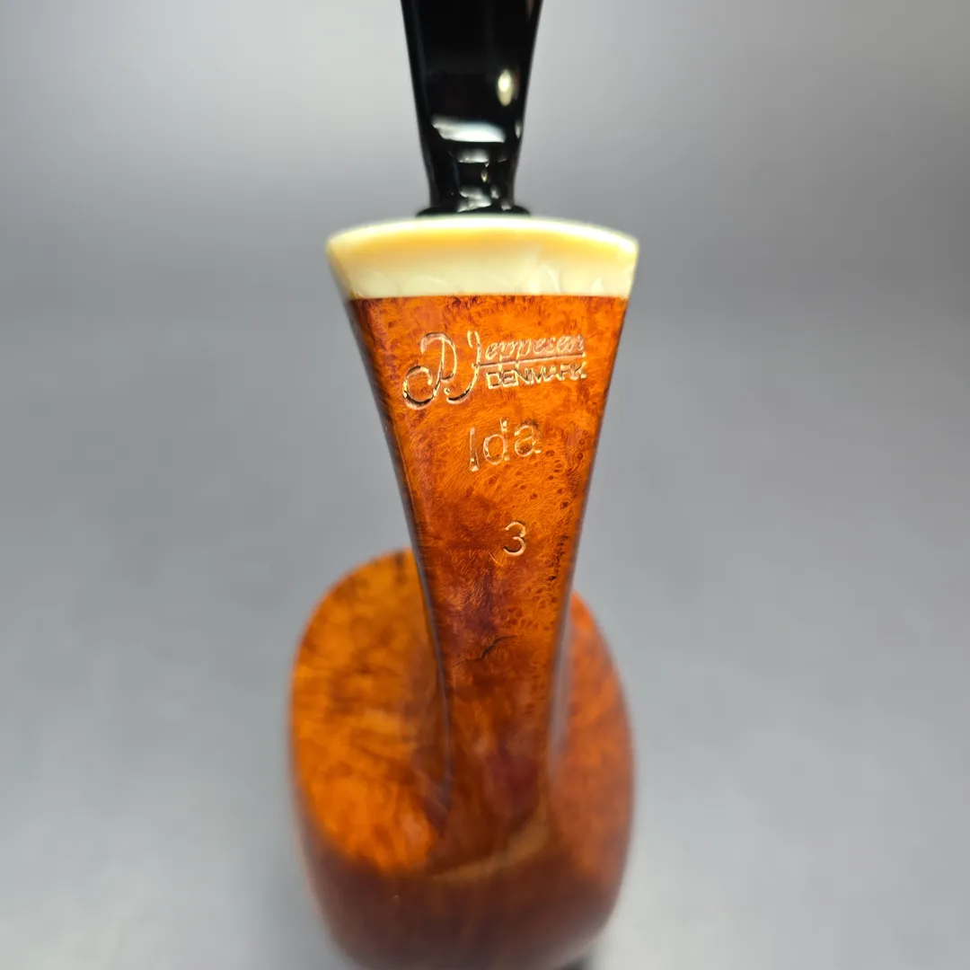 Peder Jeppesen’s pipes are roughly divided into two categories: his Neerup pipes, which fully embody his inimitable style at a surprisingly affordable price point; and the pipes made under his given name, P. Jeppesen, which represent his higher-grade output. These categories are further subdivided into other categories, such Neerup’s “Basic” and “Classic” lines. With the P. Jeppesen pipes, things get a little more complicated. Today, these pipes are separated into lines such as the “Ida Easy Cut” (for shapes not normally made by Jeppesen) and the “Boutique” (for designs that include even more lavish ornamentation than usual). In the past, however, Jeppesen simply used his children’s names, such as Freja and Ida, for his higher-grade lines. This Ida grade 3 is one of the latter, taking the form of an extra large freehand Dublin, whose flame grain and light brown stain are accented by a ring of Juma.