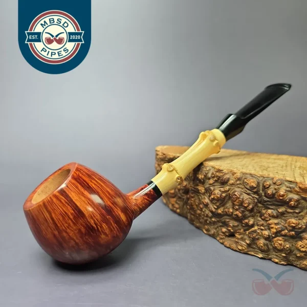 High praise indeed, especially given Pease’s station in the world of pipes. What more could one add? Regarding this one, it’s on the smaller side, just as Pease remarks, but still with enough volume in the chamber to prevent one from being hurried. On the other hand, these smaller proportions allow the pipe to be under an ounce in weight, meaning one could easily clench it and puff away on the go. The pipe is a grade “A,” used for especially well grained pipes (as can be seen quite plainly here), and which was only outclassed by “S” grade pieces. Last, the bamboo shank extension is expertly applied, with its ebonite joints sculpted following the furrows of the plant, resulting in a seamless transition between the pipe’s constitutive materials.