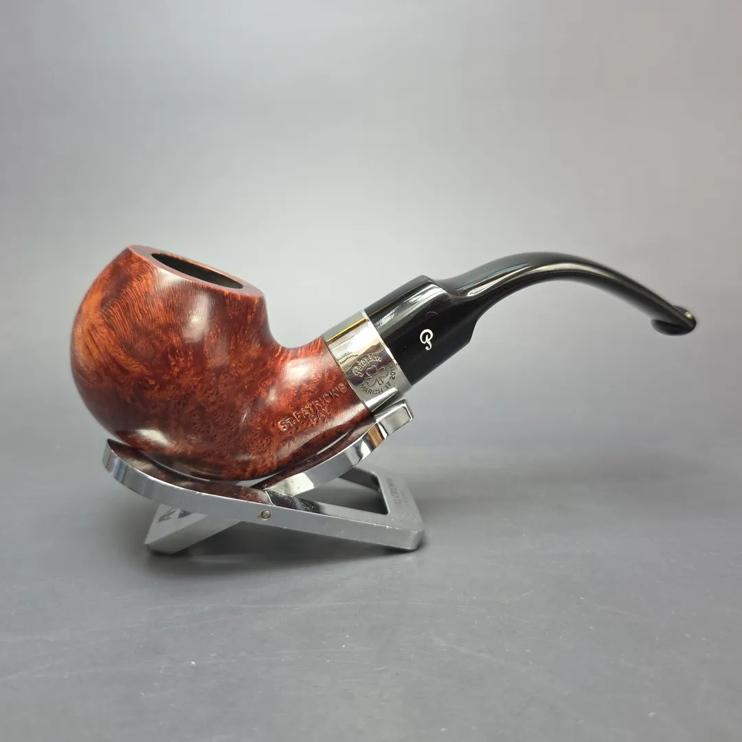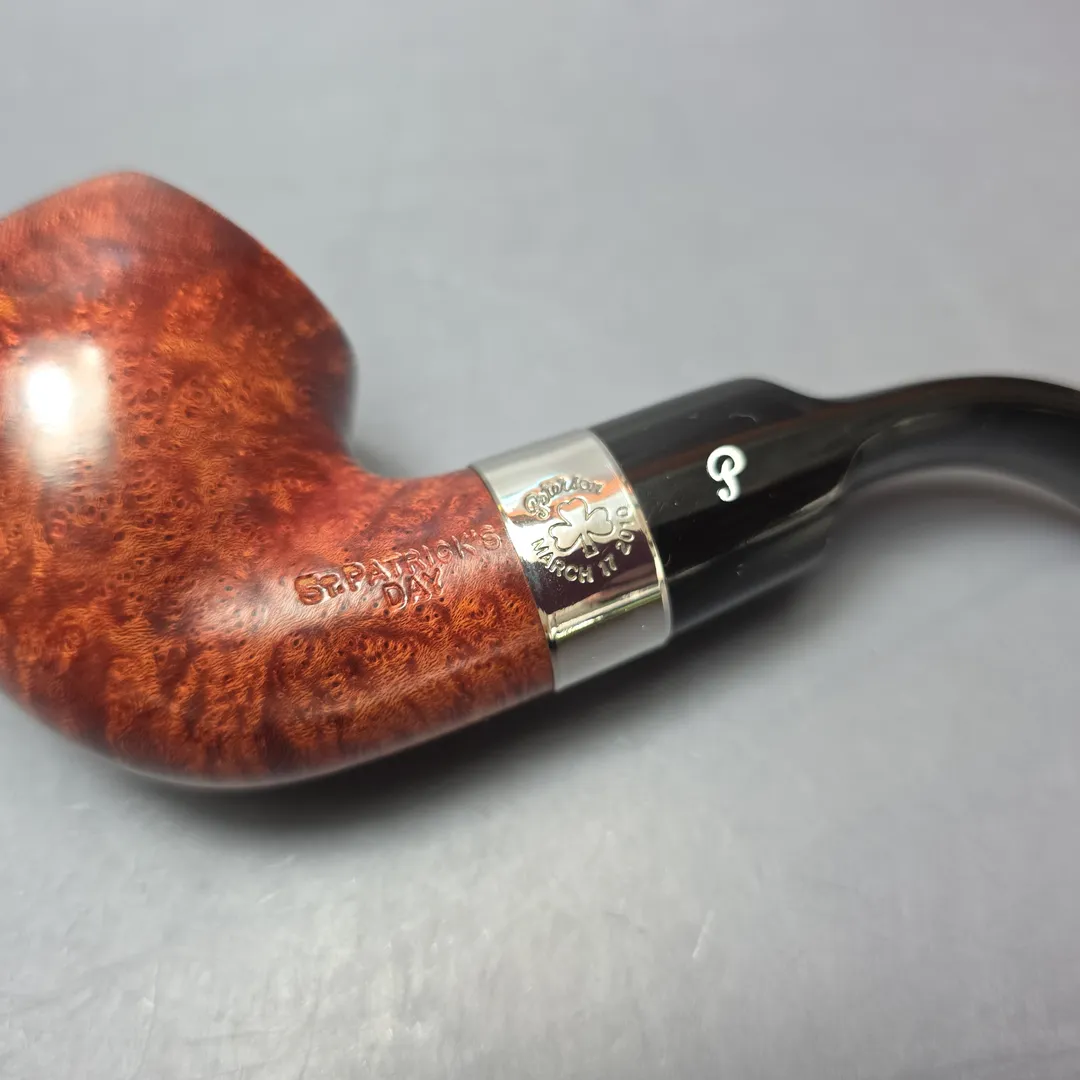 It is only natural that the great Irish pipe company Peterson should honor Ireland’s patron saint, which they have done each year since 1998. These St Patrick’s Day pipes are always a limited edition make and each is distinct from the last. They are, as a consequence, collectors’ items, as well as great smokers. The 2010 release was distinguished by its warm, chestnut finish, black vulcanite mouthpiece, and specially engraved nickel collar. This one is rendered in Peterson’s classic large, full bent apple rendition, the XL02, following the tradition of the St Patrick’s Day releases, which typically focus on house shapes with a seasonal twist.