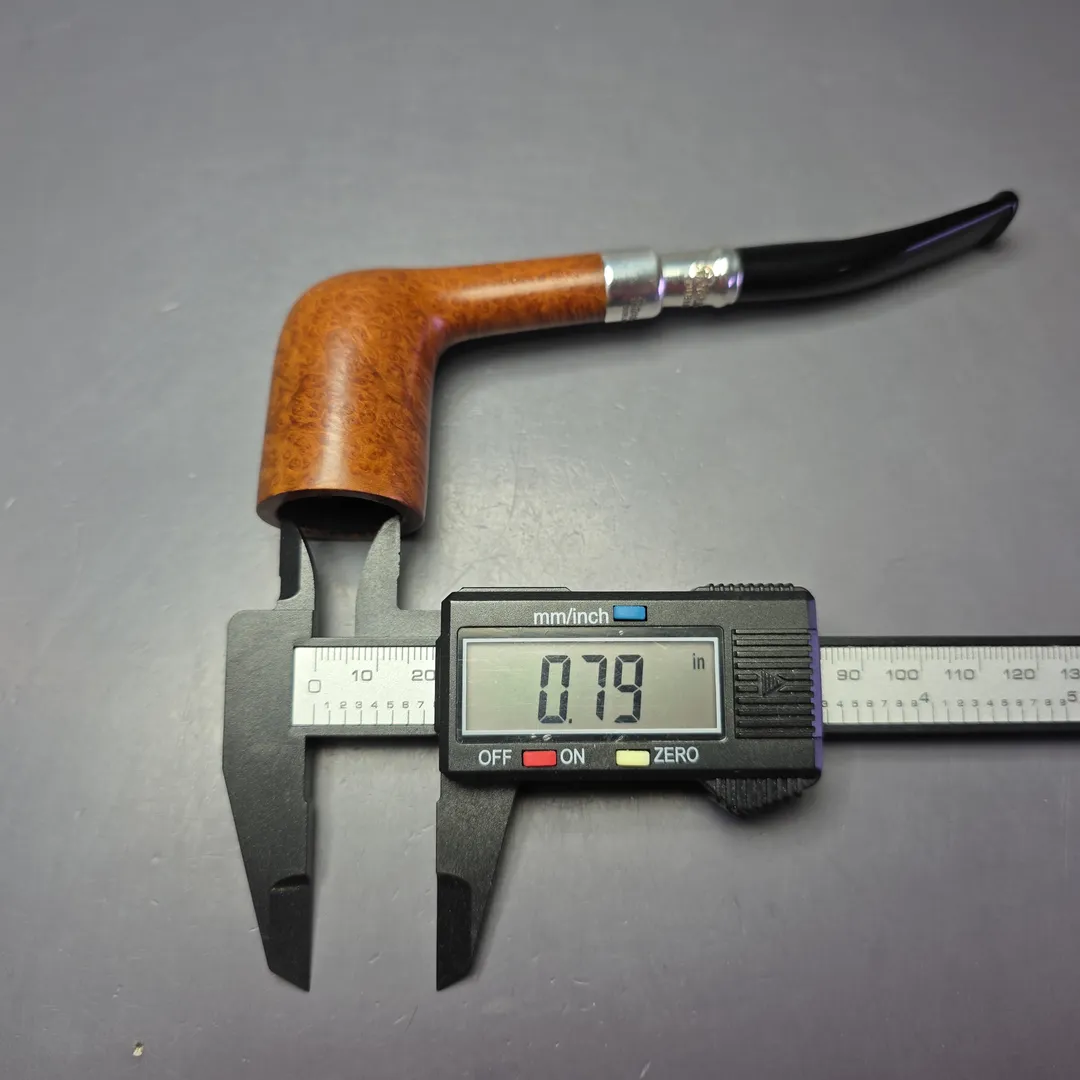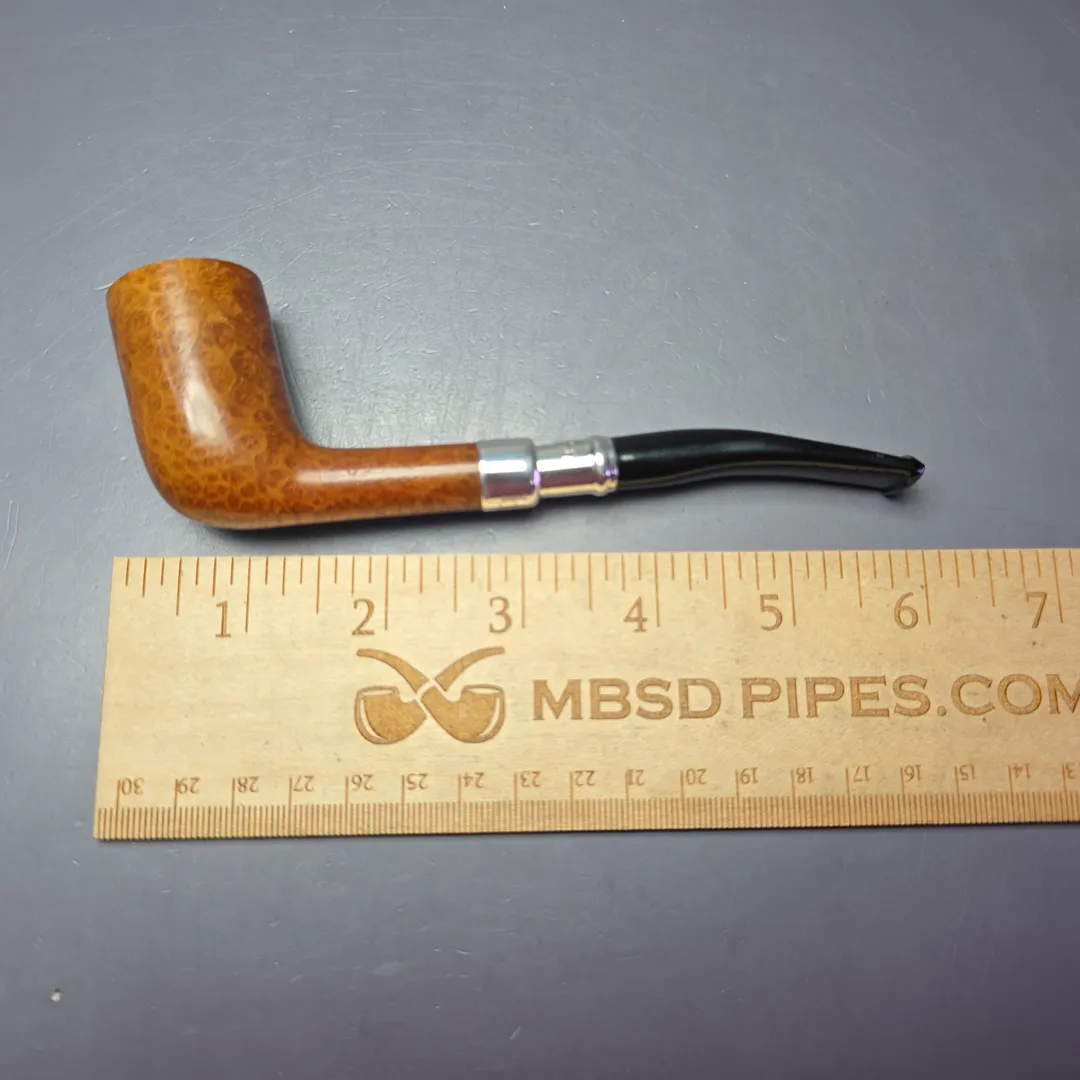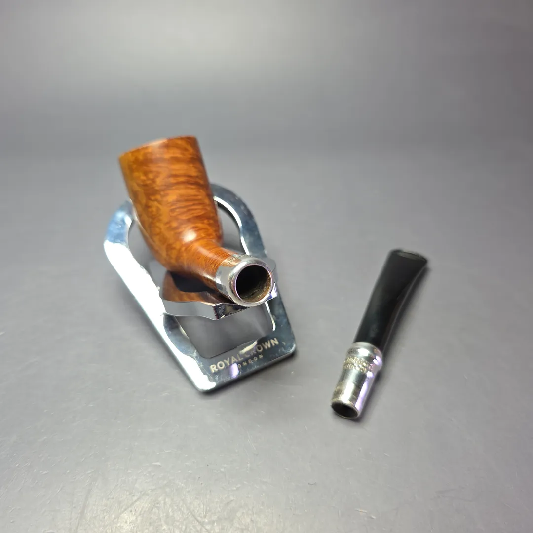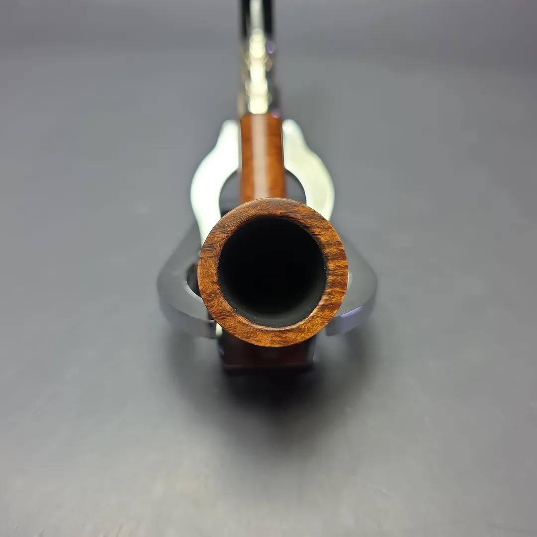 Like Dunhill and Barling’s, Peterson has a long and rich history with silver-mounted pipes, and is one of the few companies to still employ master silversmiths to turn and mount such precious metal adornments entirely in-house at its Dublin premises. Sterling silver spigots have been part of Peterson’s catalog since the early 1900s and remain at the high-end of the company’s output, though there are few pipes quite as high-end as the Natural Spigot. Across Peterson’s many lines and series, the Natural finish is reserved exclusively for bowls with perfect, consistent graining. Only a small fraction of bowls turned annually qualify for this distinction, and fewer still are subsequently fitted with sterling silver spigot mounts. As such, the Natural Spigot is far more uncommon than the majority of Peterson’s other pipes, and when one does become available, it commands a hefty premium. This one is an exceptionally beautiful specimen, with bird’s-eye covering either side of the bowl and tight cross-grain running along the entirety of its fore, aft, topside, and underside.