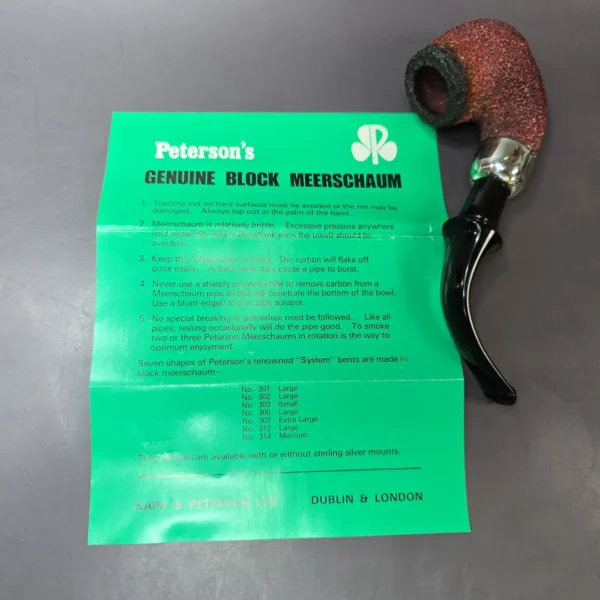 For a short while around the 1970s, Peterson partnered with British company Laxey Pipes to produce Peterson-brand, African meerschaum pipes, many of which were rendered in Peterson’s own classic shapes. This one, for example, is a rendition of Peterson’s “312” System army mount bent billiard, dressed in a rusticated, fumed finish typical of African meerschaum pipes. As very few of these Peterson meerschaum pipes were made (in part due to the closure of meerschaum mines in Tanzania in the later 20th century), they are among the most collectible Peterson pipes around.