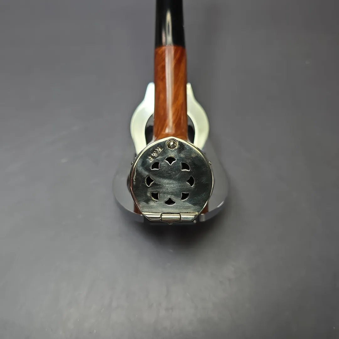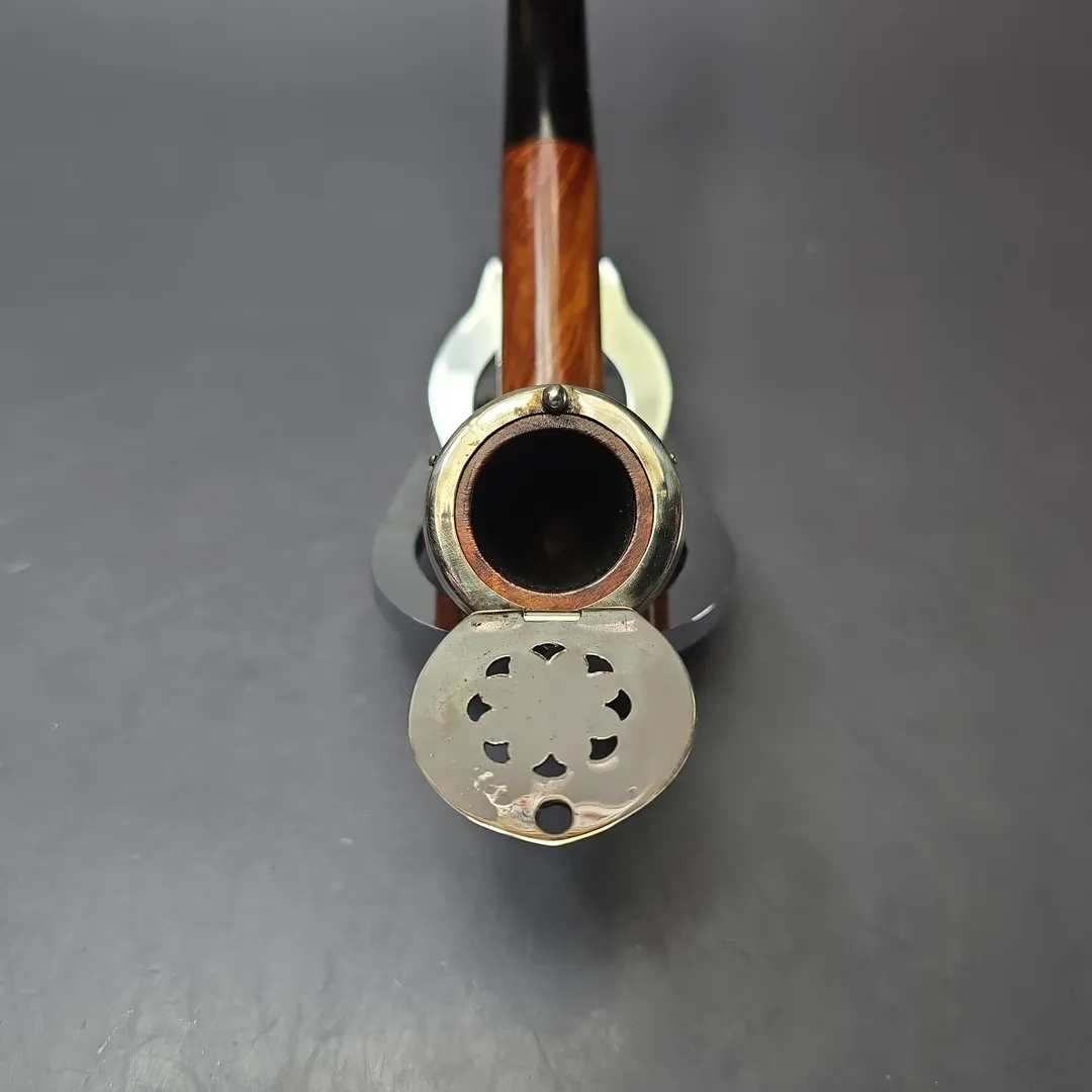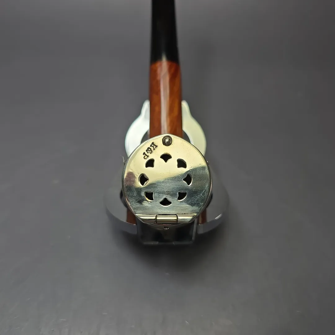 The 21st century has seen Peterson thoroughly embracing the new, with novel shapes, lines, and finishes. But it’s also seen the company leaning into its 150+ year history, reviving design elements that had long been forgotten. In the case of this pipe, “forgotten” is an especially apt descriptor. In the 2010s, Peterson’s workers discovered boxes of nickel wind caps in the back rooms of its factory, dating to some of the earliest decades of Kapp & Peterson pipes. This was not an isolated incident, as something similar occurred with boxes of very old, amber mouthpieces, and in both instances, Peterson’s master craftsmen opted to put these materials to use once more. In the case of the latter, these became part of the Amber Spigot line; for the former, these were used for Peterson’s Antique Nickel Cap pipes. The release was extremely limited, with fewer than 300 Antique Nickel Caps reported to have been produced. This one is an especially beautiful example, dressed in Peterson’s high-end Natural finish, and mounted with a hinged nickel lid engraved with the original K&P nomenclature.