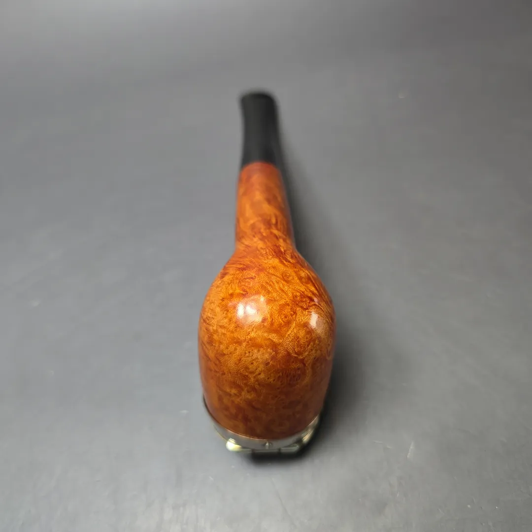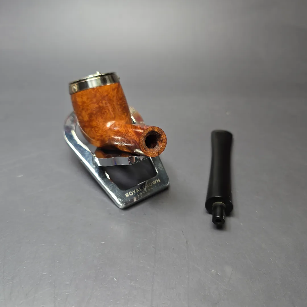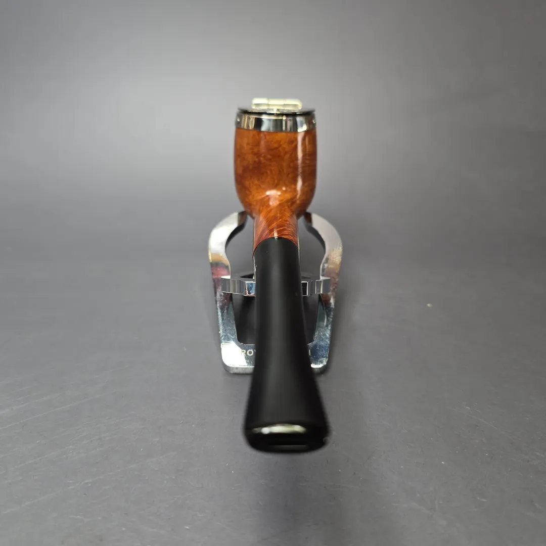 The 21st century has seen Peterson thoroughly embracing the new, with novel shapes, lines, and finishes. But it’s also seen the company leaning into its 150+ year history, reviving design elements that had long been forgotten. In the case of this pipe, “forgotten” is an especially apt descriptor. In the 2010s, Peterson’s workers discovered boxes of nickel wind caps in the back rooms of its factory, dating to some of the earliest decades of Kapp & Peterson pipes. This was not an isolated incident, as something similar occurred with boxes of very old, amber mouthpieces, and in both instances, Peterson’s master craftsmen opted to put these materials to use once more. In the case of the latter, these became part of the Amber Spigot line; for the former, these were used for Peterson’s Antique Nickel Cap pipes. The release was extremely limited, with fewer than 300 Antique Nickel Caps reported to have been produced. This one is an especially beautiful example, dressed in Peterson’s high-end Natural finish, and mounted with a hinged nickel lid engraved with the original K&P nomenclature.