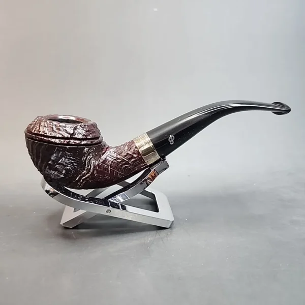 Peterson’s Christmas pipe has been an annual release since 2009, comprising a wide array of the Irish brand’s classic shapes, all united by a singular finish and handsome accents. For 2023, the line is defined by a crisp sandblast that calls back to vintage pipes from the early 20th century, stained a deep ruby hue and evocative of some of the earliest sandblasts in the pipe world. The timeless finish is accented with a band of elegant silver that features inset beadlines around Peterson’s logo, showcasing the skill of their silversmiths and adding rich contrast. A black vulcanite stem completes the look, and the refined finish here dresses the 999 Rhodesian.