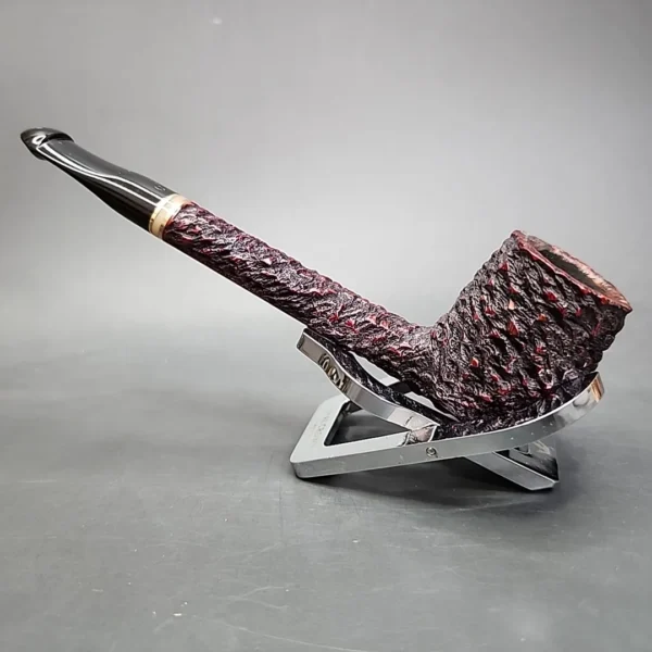 As far as I’ve read, the Peterson’s Emerald series debuted in the late-1980s, though like with many Peterson series, it has changed over the decades. This looks to be an older one, especially judging by the nomenclature. It features what Mark Irwin at Peterson Pipe Notes refers to as a “pebble grain” rustication, which was typical of the first iteration of the Emerald, rather than the scooped finish seen on the contemporary one. Eagle-eyed viewers will also note that the namesake “emerald” band sandwiched between two brass ones at the end of the shank is not green, but has faded to more of an ivory or abalone hue. This is something that happened to the original Emerald pipes, though I personally find it even more attractive.